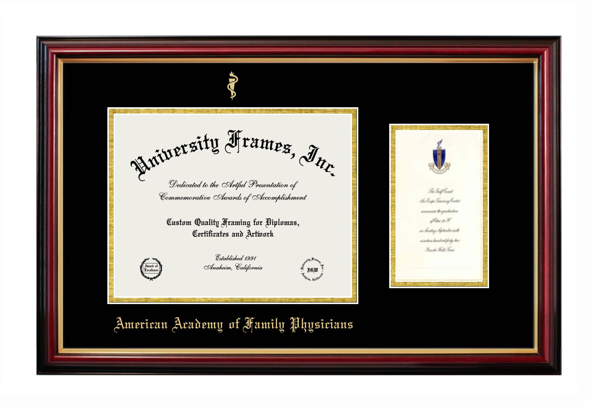 Are you a American Academy of Family Physicians graduate looking for an officially licensed diploma frame to showcase your achievement? Or, are you looking for a unique graduation gift for a recent American Academy of Family Physicians graduate or alum? You have come to the right place! Our officially licensed custom diploma frames have the original seal of American Academy of Family Physicians. Each of our degree frames is handcrafted to offer the highest quality and precision. You can easily customize your graduation frames according to your style and preference. Start customizing your college diploma frame now!