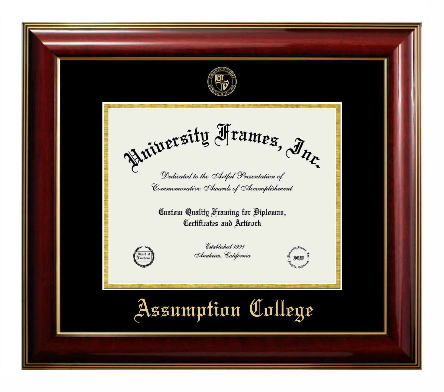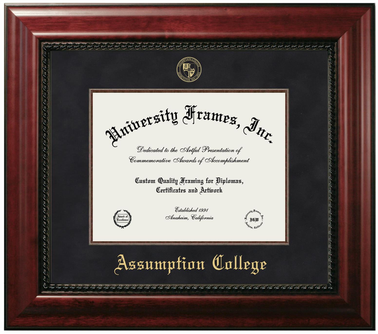Are you a Assumption College graduate looking for an officially licensed diploma frame to showcase your achievement? Or, are you looking for a unique graduation gift for a recent Assumption College graduate or alum? You have come to the right place! Our officially licensed custom diploma frames have the original seal of Assumption College. Each of our degree frames is handcrafted to offer the highest quality and precision. You can easily customize your graduation frames according to your style and preference. Start customizing your college diploma frame now!