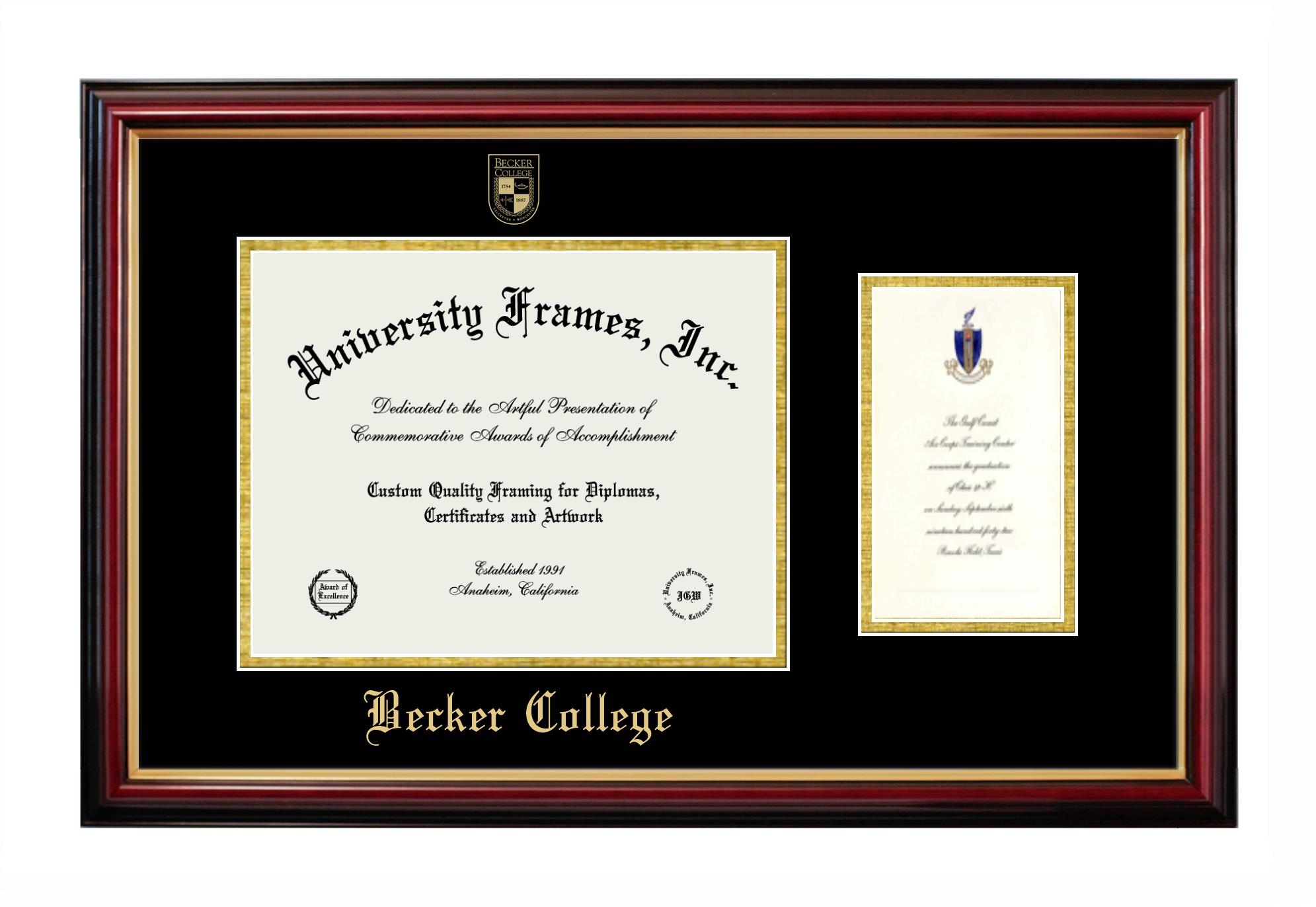 Are you a Becker College graduate looking for an officially licensed diploma frame to showcase your achievement? Or, are you looking for a unique graduation gift for a recent Becker College graduate or alum? You have come to the right place! Our officially licensed custom diploma frames have the original seal of Becker College. Each of our degree frames is handcrafted to offer the highest quality and precision. You can easily customize your graduation frames according to your style and preference. Start customizing your college diploma frame now!