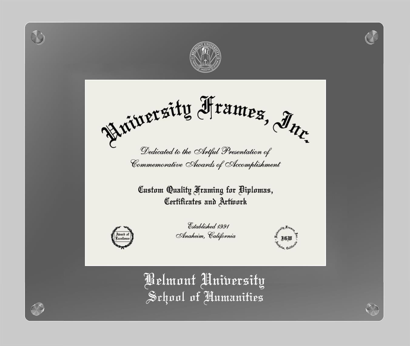 Are you a Belmont University School of Humanities graduate looking for an officially licensed diploma frame to showcase your achievement? Or, are you looking for a unique graduation gift for a recent Belmont University School of Humanities graduate or alum? You have come to the right place! Our officially licensed custom diploma frames have the original seal of Belmont University School of Humanities. Each of our degree frames is handcrafted to offer the highest quality and precision. You can easily customize your graduation frames according to your style and preference. Start customizing your college diploma frame now!