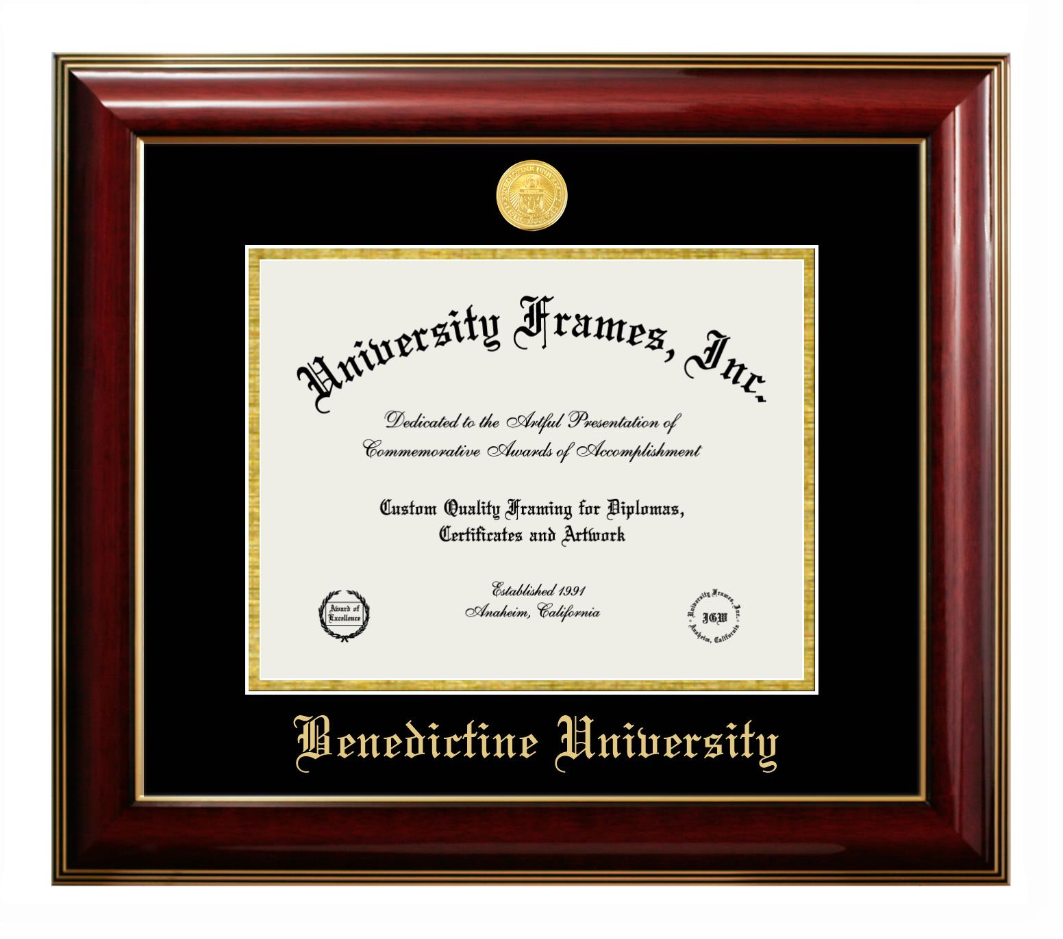 Are you a Benedictine University graduate looking for an officially licensed diploma frame to showcase your achievement? Or, are you looking for a unique graduation gift for a recent Benedictine University graduate or alum? You have come to the right place! Our officially licensed custom diploma frames have the original seal of Benedictine University. Each of our degree frames is handcrafted to offer the highest quality and precision. You can easily customize your graduation frames according to your style and preference. Start customizing your college diploma frame now!