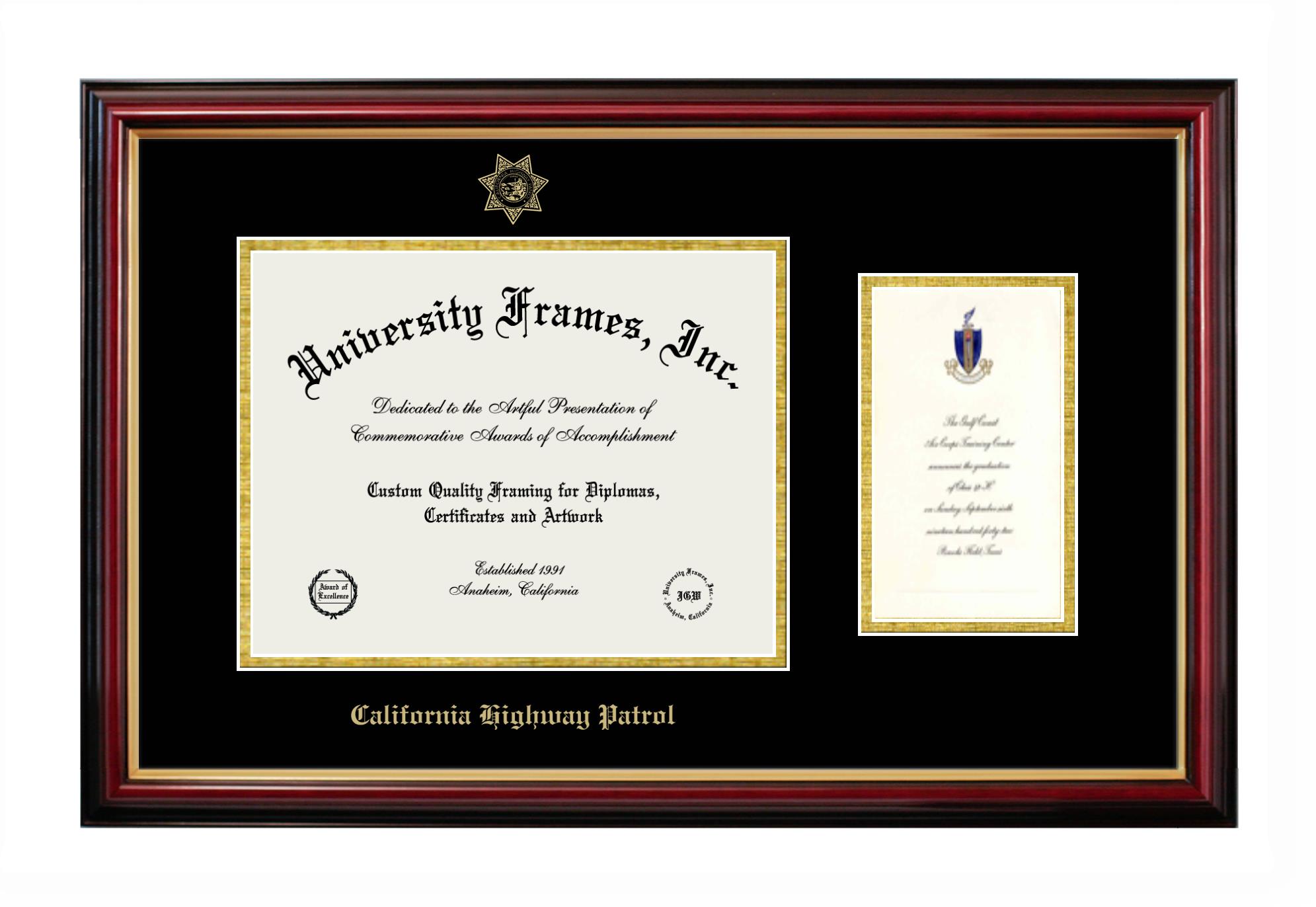 If you are a recent California Highway Patrol graduate or an alum looking for a professional diploma frame to show off your accomplishment, look no further. We provide officially licensed custom diploma frames that come with the original California Highway Patrol seal. Our handcrafted degree frames make an ideal graduation gift for any California Highway Patrol recent graduate or alum. Each diploma frame is carefully crafted and inspected for quality and precision. Our graduation frames can be easily customized according to your taste and preference. Customize your college diploma frame now!