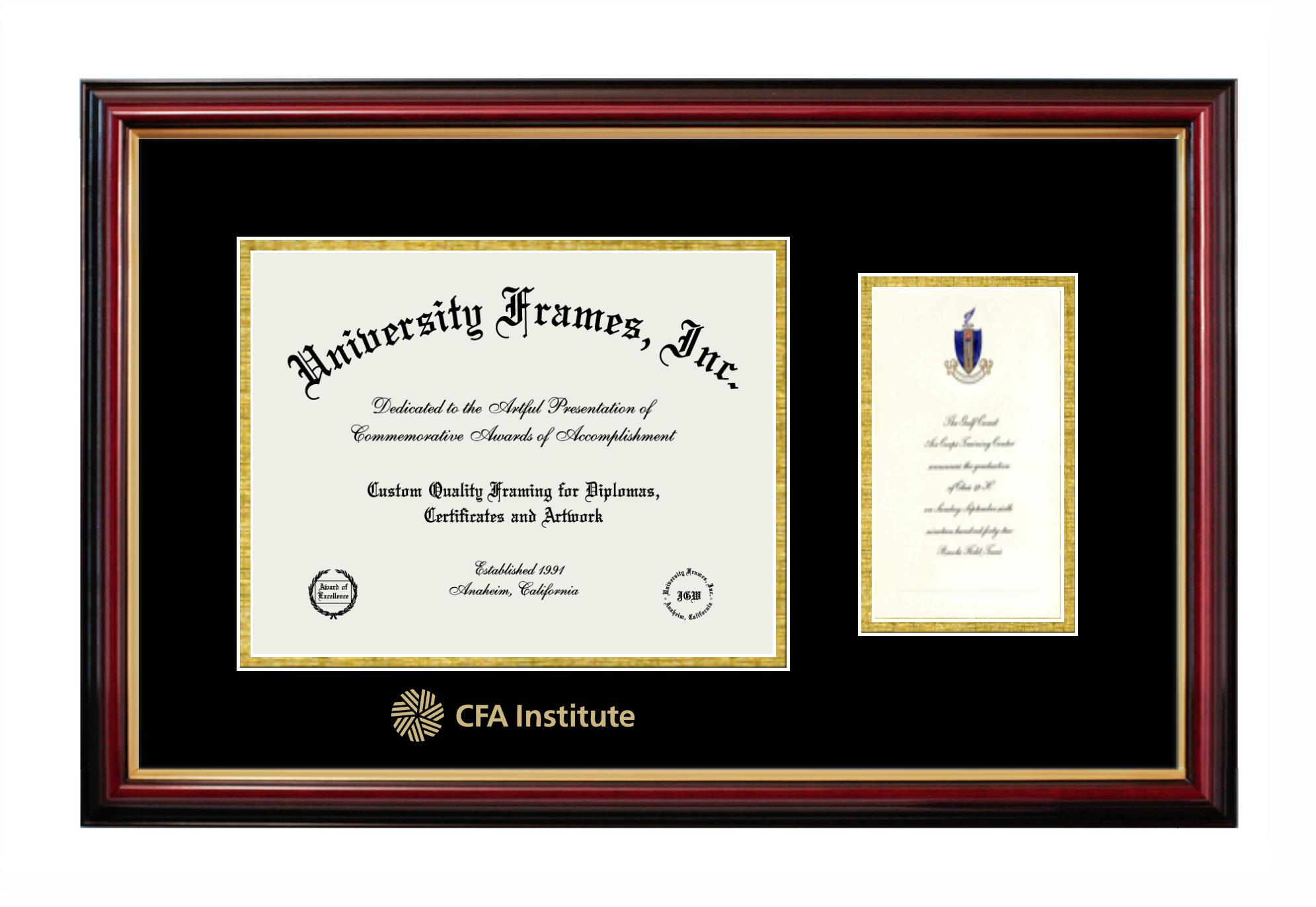 If you are a recent CFA Institute graduate or an alum looking for a professional diploma frame to show off your accomplishment, look no further. We provide officially licensed custom diploma frames that come with the original CFA Institute seal. Our handcrafted degree frames make an ideal graduation gift for any CFA Institute recent graduate or alum. Each diploma frame is carefully crafted and inspected for quality and precision. Our graduation frames can be easily customized according to your taste and preference. Customize your college diploma frame now!