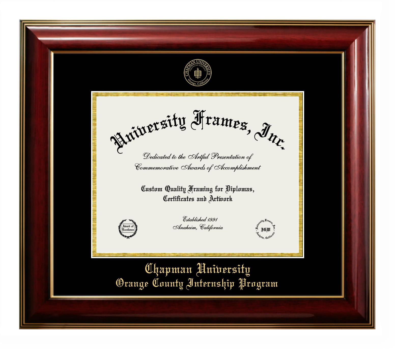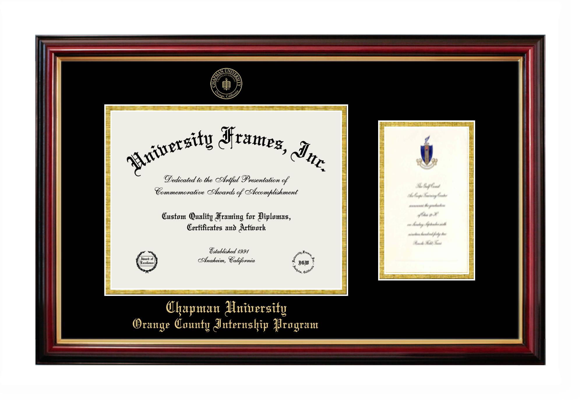 If you are a recent Chapman University Orange County Internship Program graduate or an alum looking for a professional diploma frame to show off your accomplishment, look no further. We provide officially licensed custom diploma frames that come with the original Chapman University Orange County Internship Program seal. Our handcrafted degree frames make an ideal graduation gift for any Chapman University Orange County Internship Program recent graduate or alum. Each diploma frame is carefully crafted and inspected for quality and precision. Our graduation frames can be easily customized according to your taste and preference. Customize your college diploma frame now!