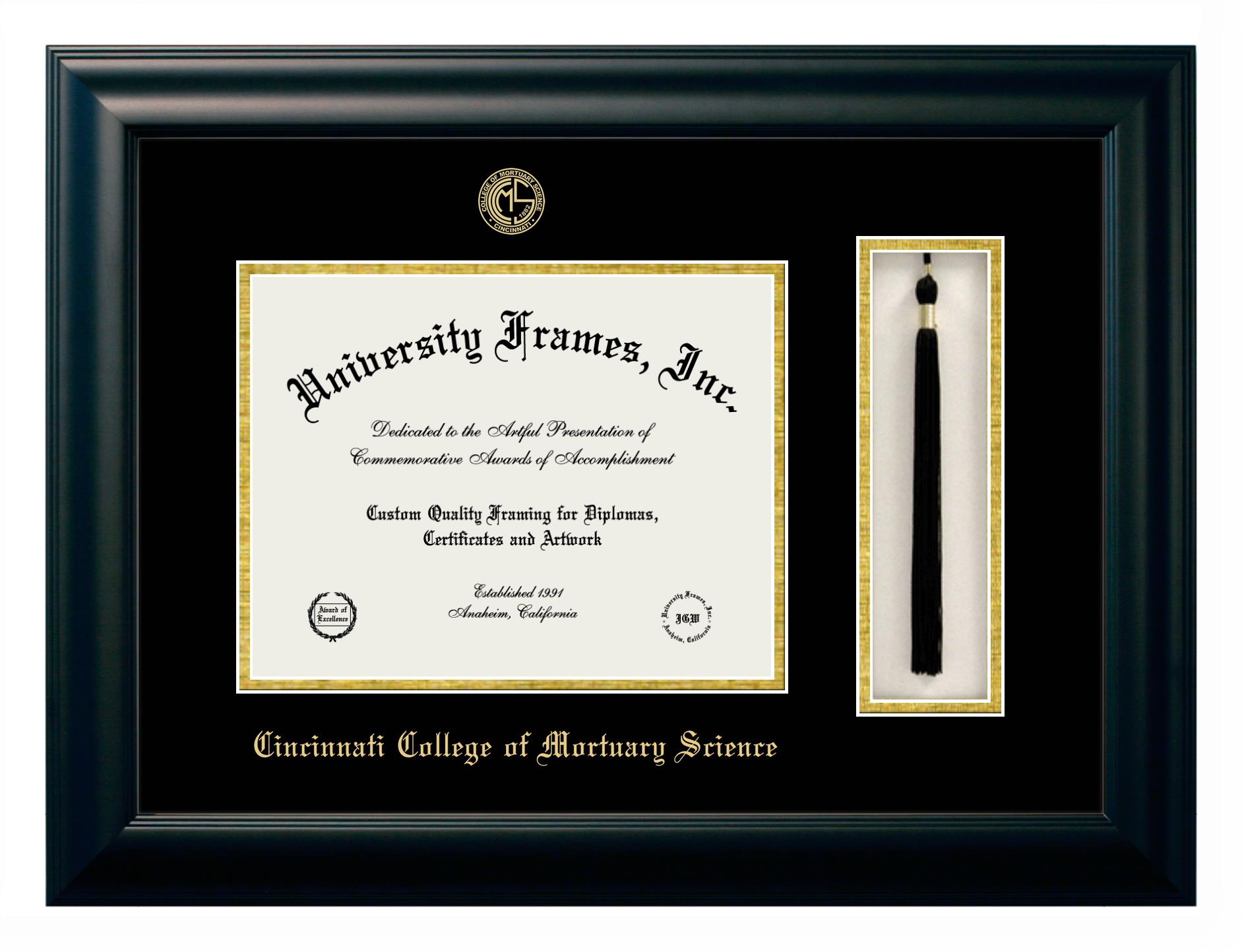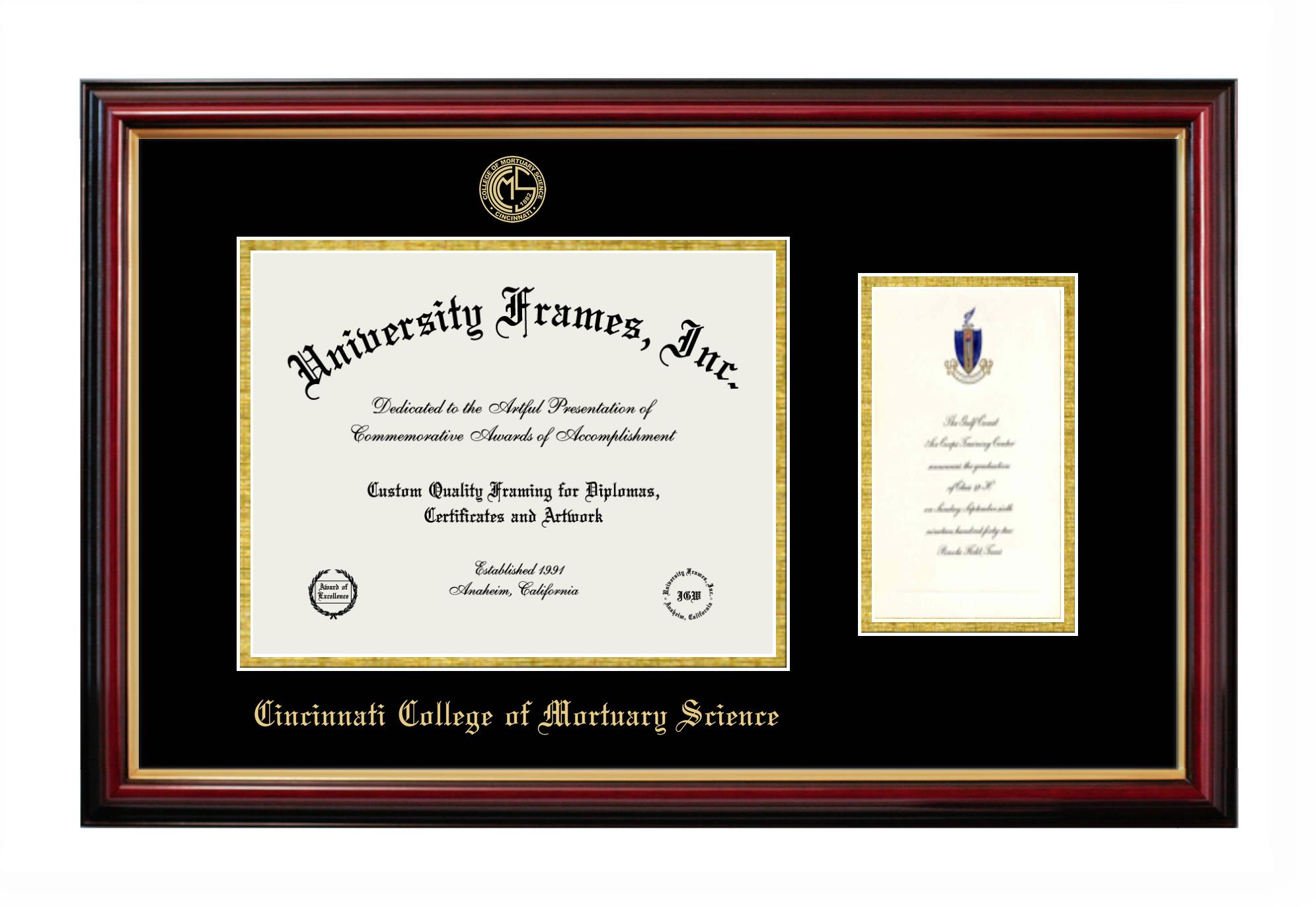 If you are a recent Cincinnati College of Mortuary Science graduate or an alum looking for a professional diploma frame to show off your accomplishment, look no further. We provide officially licensed custom diploma frames that come with the original Cincinnati College of Mortuary Science seal. Our handcrafted degree frames make an ideal graduation gift for any Cincinnati College of Mortuary Science recent graduate or alum. Each diploma frame is carefully crafted and inspected for quality and precision. Our graduation frames can be easily customized according to your taste and preference. Customize your college diploma frame now!