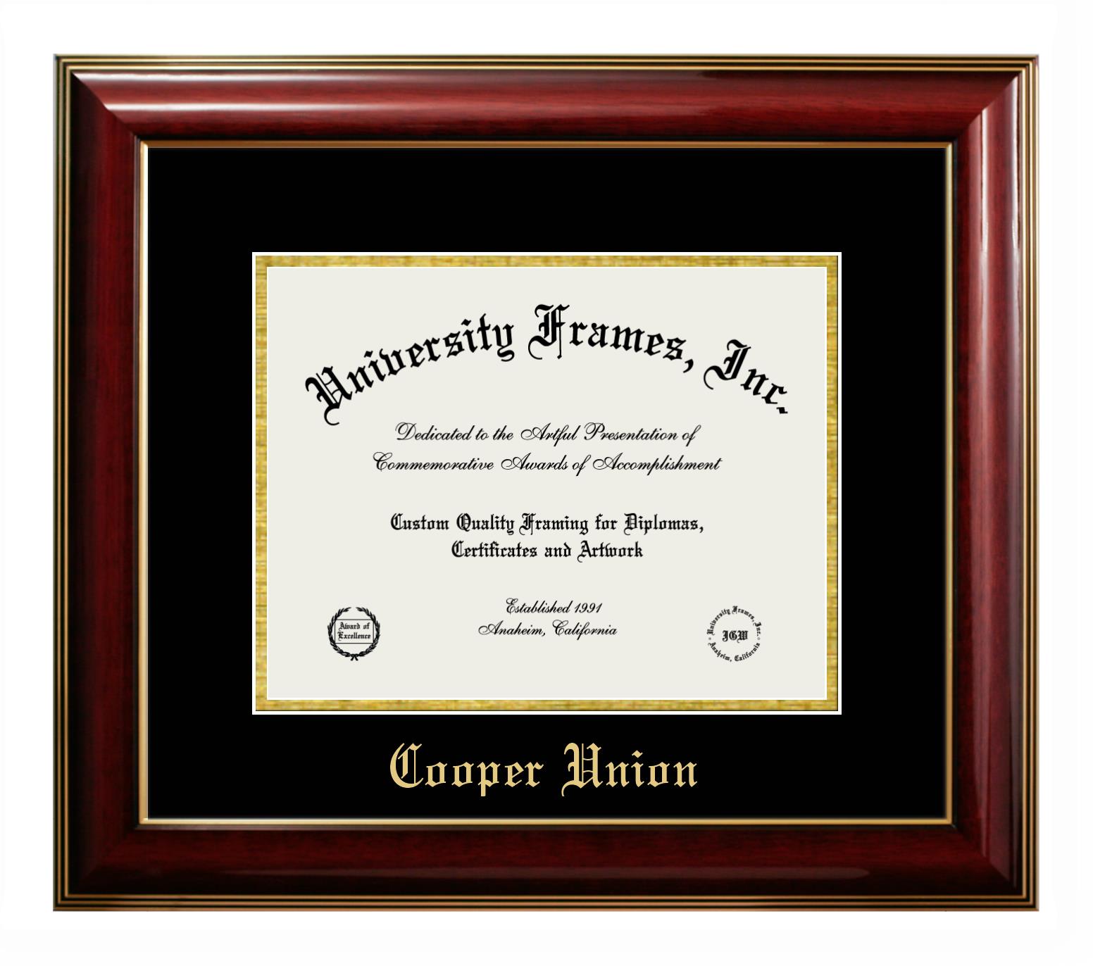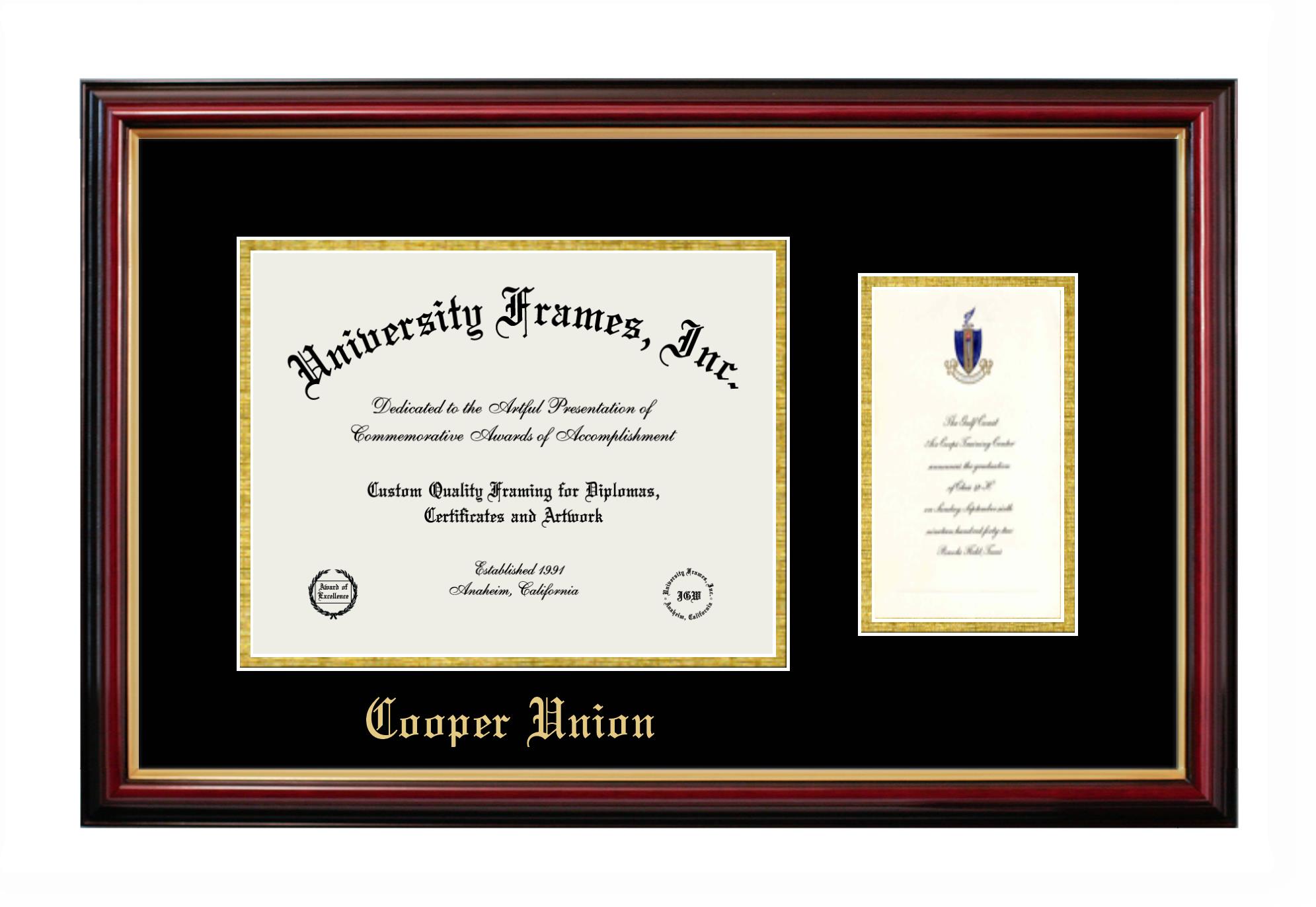 If you are a recent Cooper Union graduate or an alum looking for a professional diploma frame to show off your accomplishment, look no further. We provide officially licensed custom diploma frames that come with the original Cooper Union seal. Our handcrafted degree frames make an ideal graduation gift for any Cooper Union recent graduate or alum. Each diploma frame is carefully crafted and inspected for quality and precision. Our graduation frames can be easily customized according to your taste and preference. Customize your college diploma frame now!