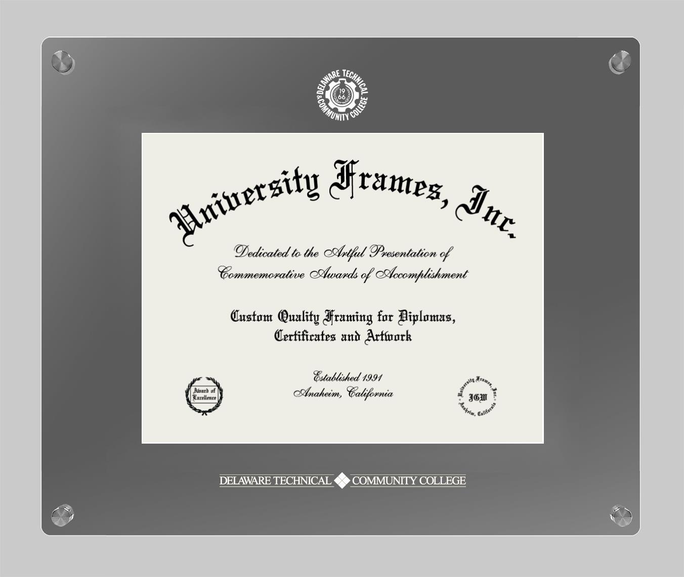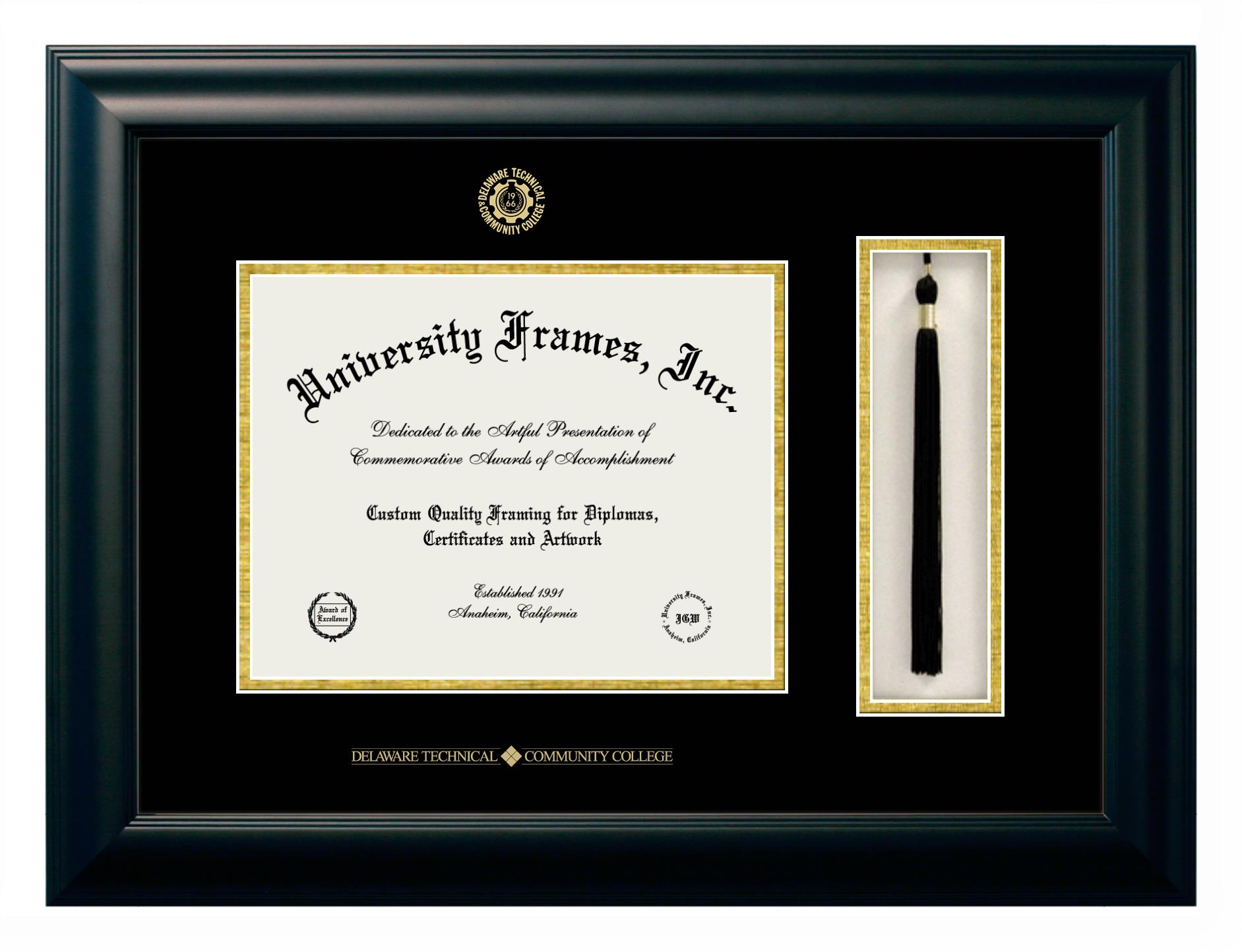 Showcase your achievement with a professional Delaware Technical Community College diploma frame. We offer officially licensed custom diploma frames that have the original Delaware Technical Community College seal. Our degree frames make great graduation gifts. All our frames are handcrafted to meet your style and preference. Each frame is carefully inspected to achieve the highest quality standards and precision. You can easily customize your college diploma frame with our online design tool. Customize your diploma frame now!