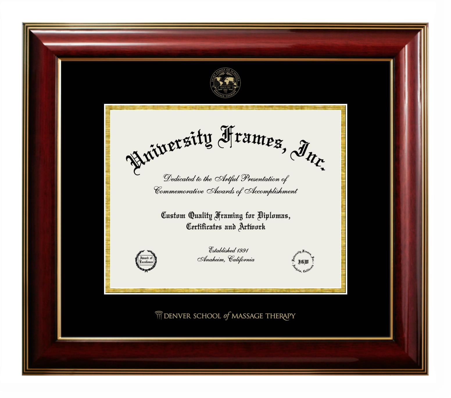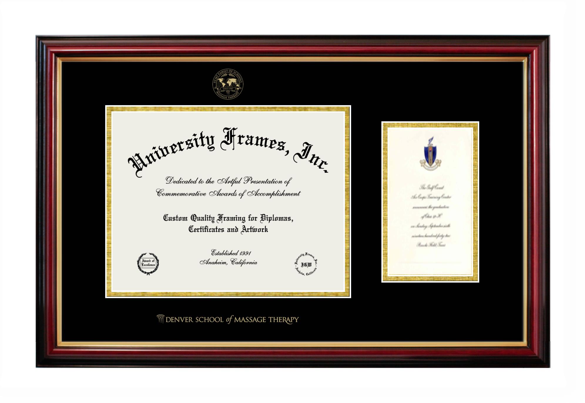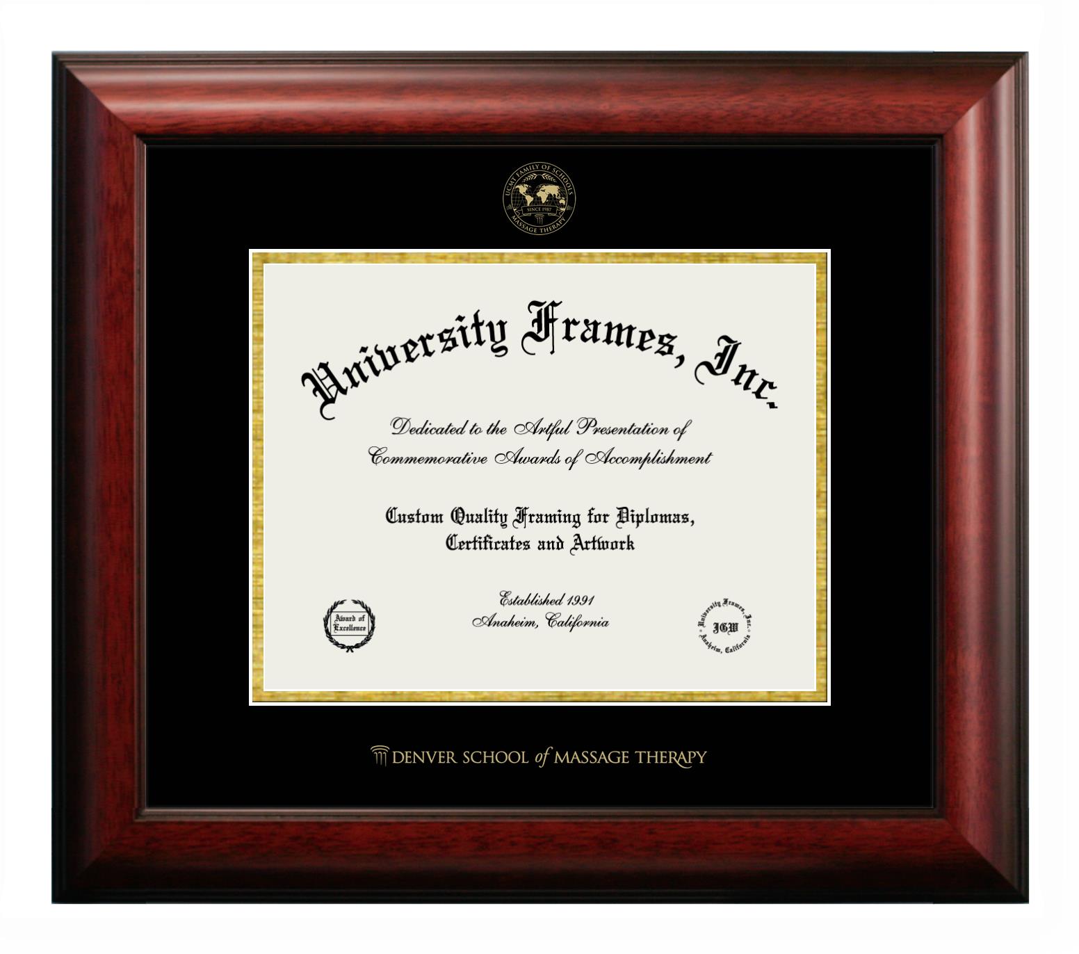 Showcase your achievement with a professional Denver School of Massage Therapy diploma frame. We offer officially licensed custom diploma frames that have the original Denver School of Massage Therapy seal. Our degree frames make great graduation gifts. All our frames are handcrafted to meet your style and preference. Each frame is carefully inspected to achieve the highest quality standards and precision. You can easily customize your college diploma frame with our online design tool. Customize your diploma frame now!