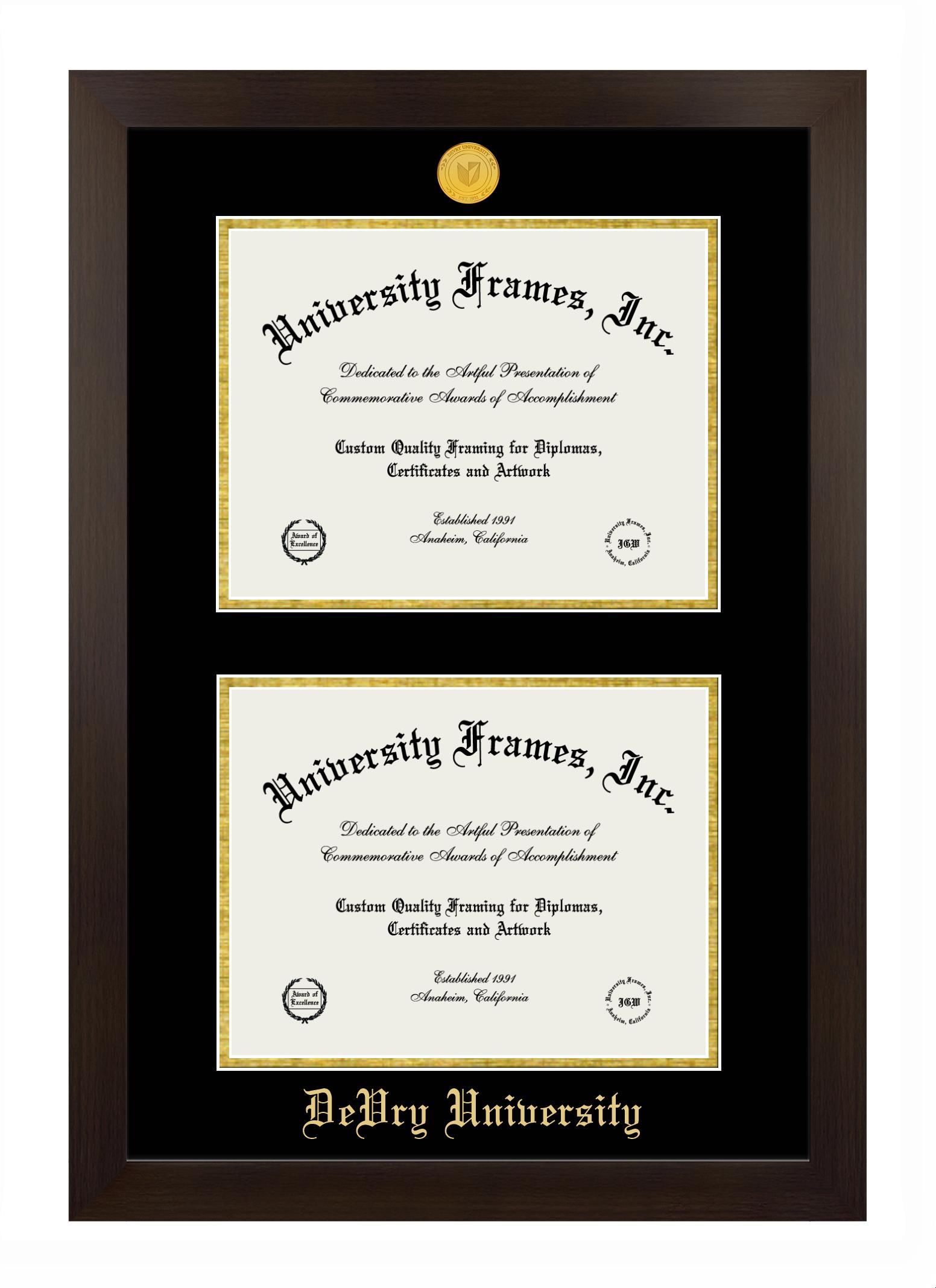 Showcase your achievement with a professional DeVry University diploma frame. We offer officially licensed custom diploma frames that have the original DeVry University seal. Our degree frames make great graduation gifts. All our frames are handcrafted to meet your style and preference. Each frame is carefully inspected to achieve the highest quality standards and precision. You can easily customize your college diploma frame with our online design tool. Customize your diploma frame now!
