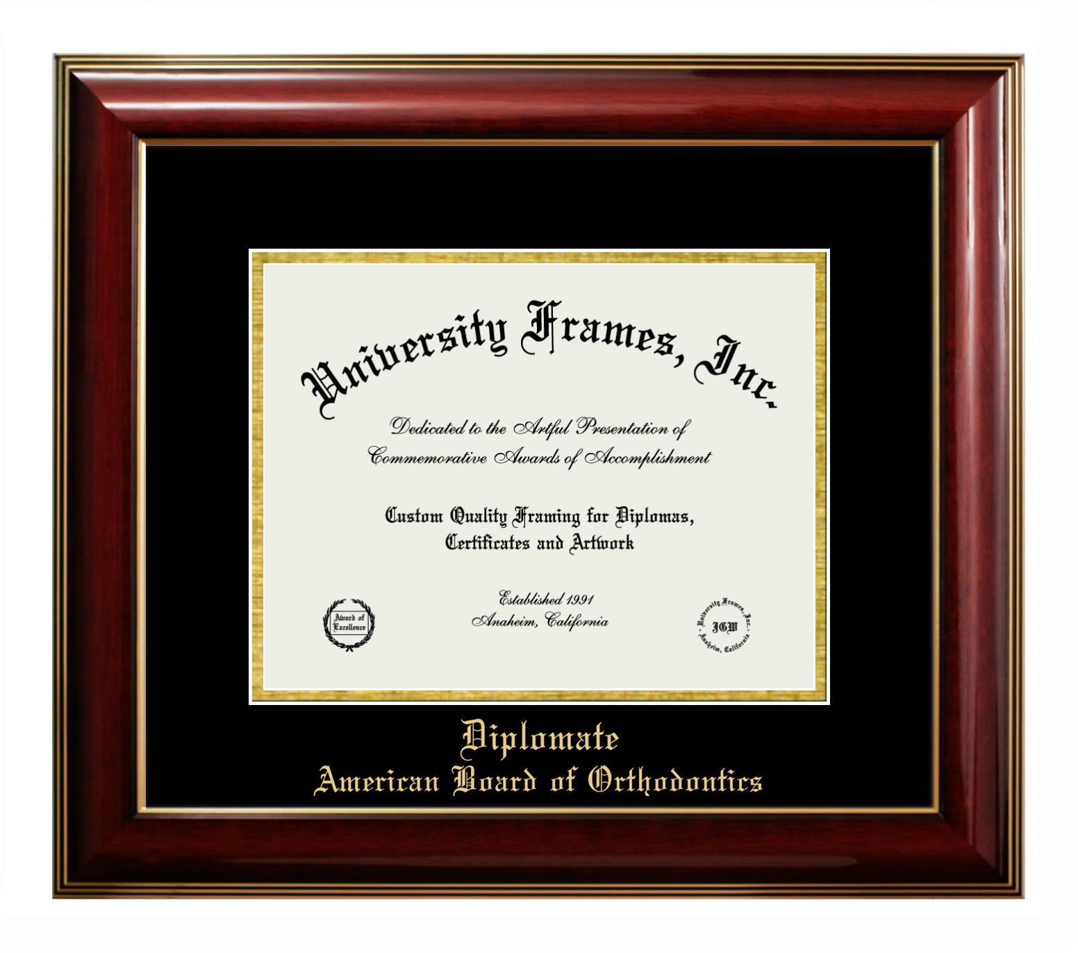 Showcase your achievement with a professional Diplomate American Board of Orthodontics diploma frame. We offer officially licensed custom diploma frames that have the original Diplomate American Board of Orthodontics seal. Our degree frames make great graduation gifts. All our frames are handcrafted to meet your style and preference. Each frame is carefully inspected to achieve the highest quality standards and precision. You can easily customize your college diploma frame with our online design tool. Customize your diploma frame now!
