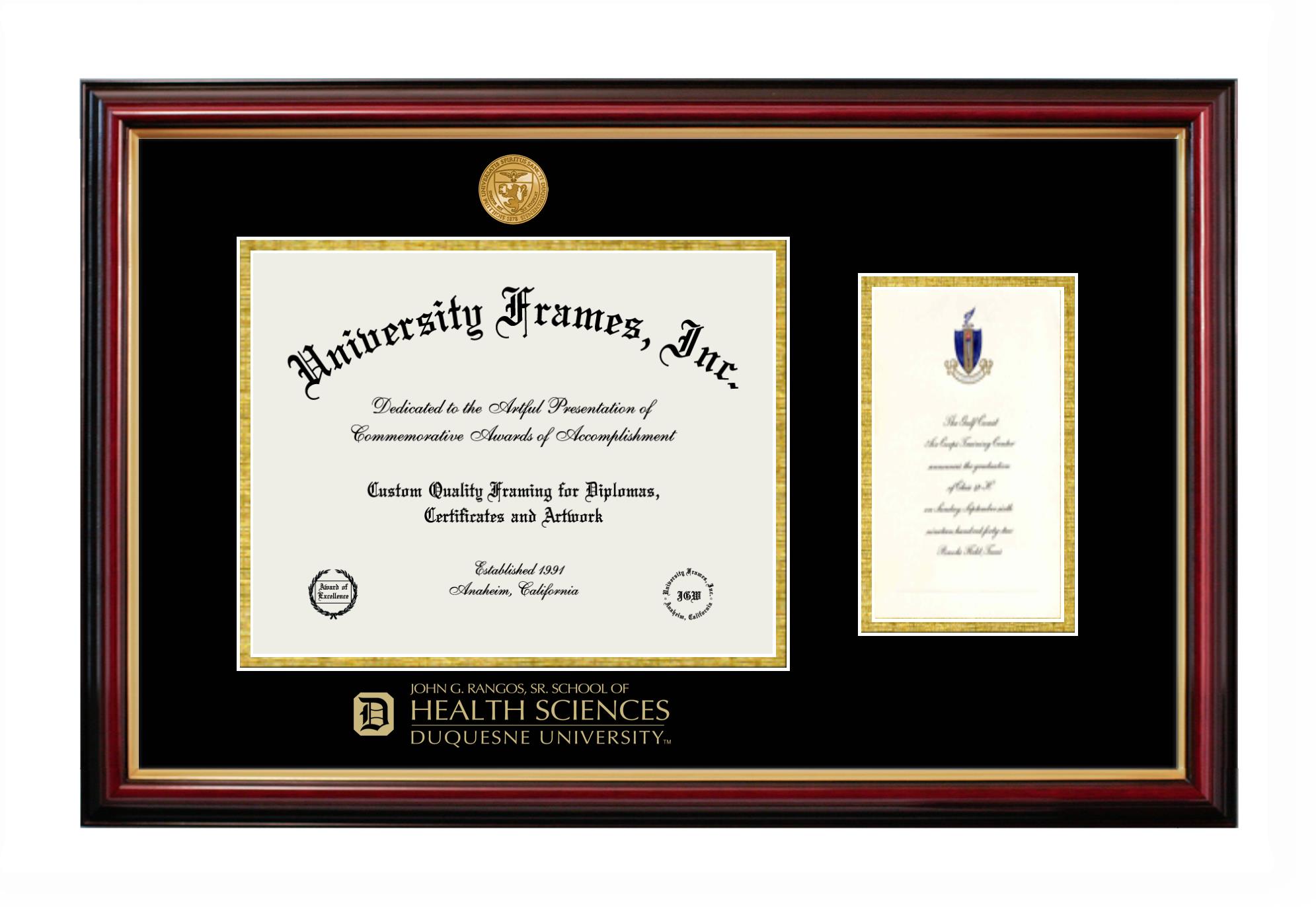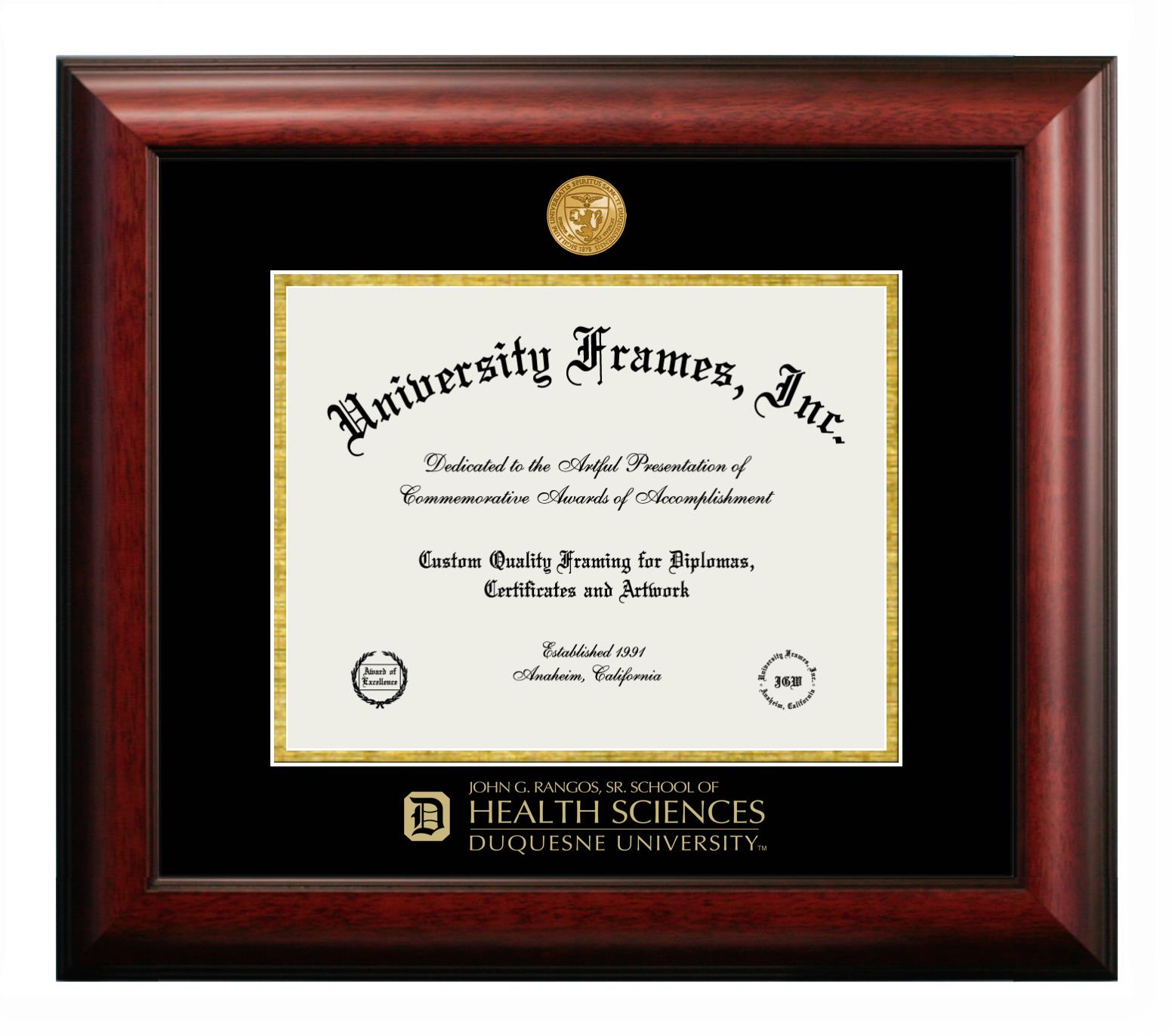 Showcase your achievement with a professional Duquesne University John G. Rangos, Sr. School of Health Sciences diploma frame. We offer officially licensed custom diploma frames that have the original Duquesne University John G. Rangos, Sr. School of Health Sciences seal. Our degree frames make great graduation gifts. All our frames are handcrafted to meet your style and preference. Each frame is carefully inspected to achieve the highest quality standards and precision. You can easily customize your college diploma frame with our online design tool. Customize your diploma frame now!