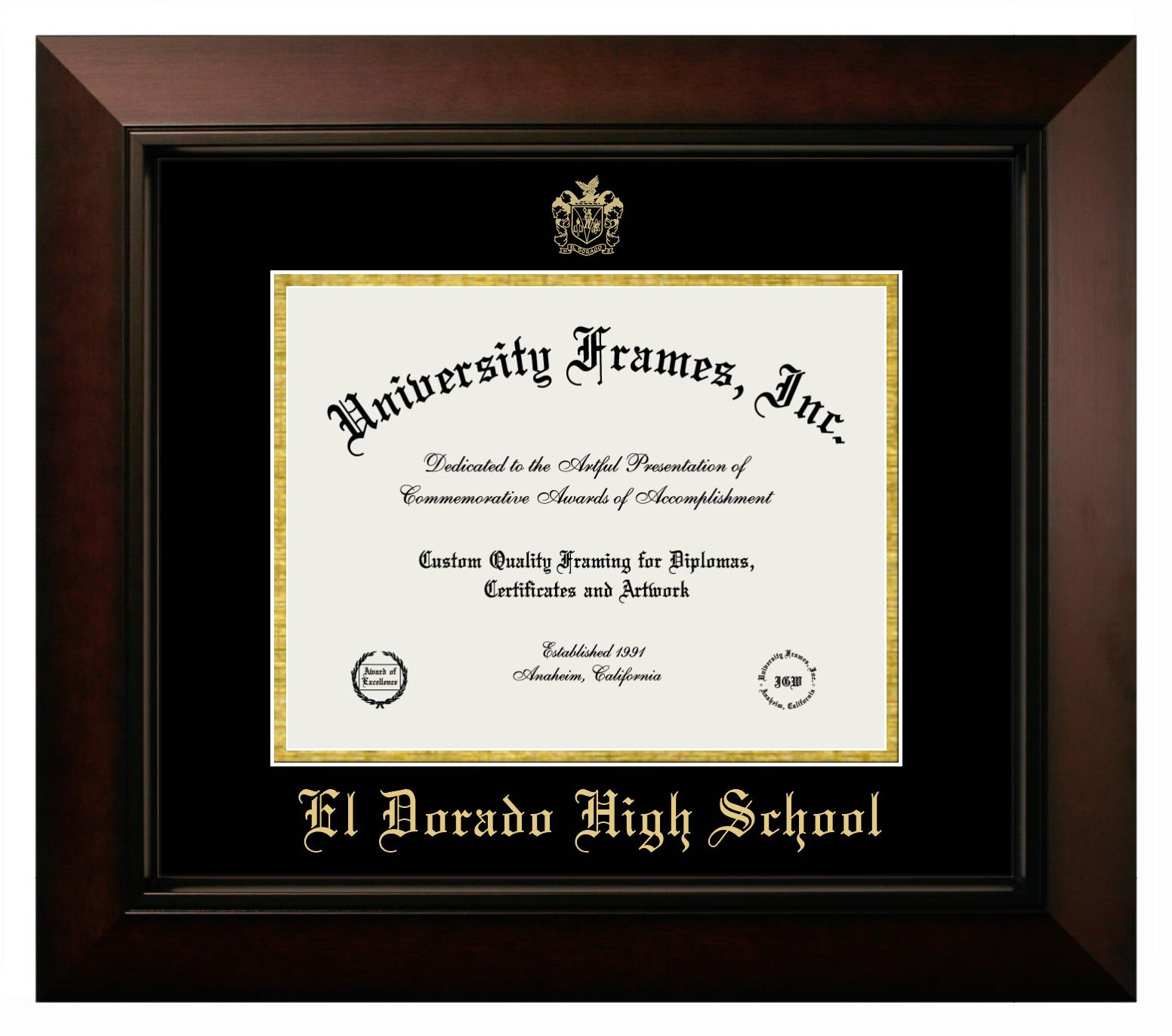 Showcase your achievement with a professional El Dorado High School diploma frame. We offer officially licensed custom diploma frames that have the original El Dorado High School seal. Our degree frames make great graduation gifts. All our frames are handcrafted to meet your style and preference. Each frame is carefully inspected to achieve the highest quality standards and precision. You can easily customize your college diploma frame with our online design tool. Customize your diploma frame now!