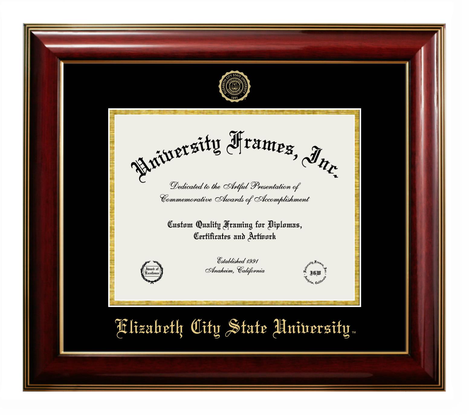 Showcase your achievement with a professional Elizabeth City State University diploma frame. We offer officially licensed custom diploma frames that have the original Elizabeth City State University seal. Our degree frames make great graduation gifts. All our frames are handcrafted to meet your style and preference. Each frame is carefully inspected to achieve the highest quality standards and precision. You can easily customize your college diploma frame with our online design tool. Customize your diploma frame now!