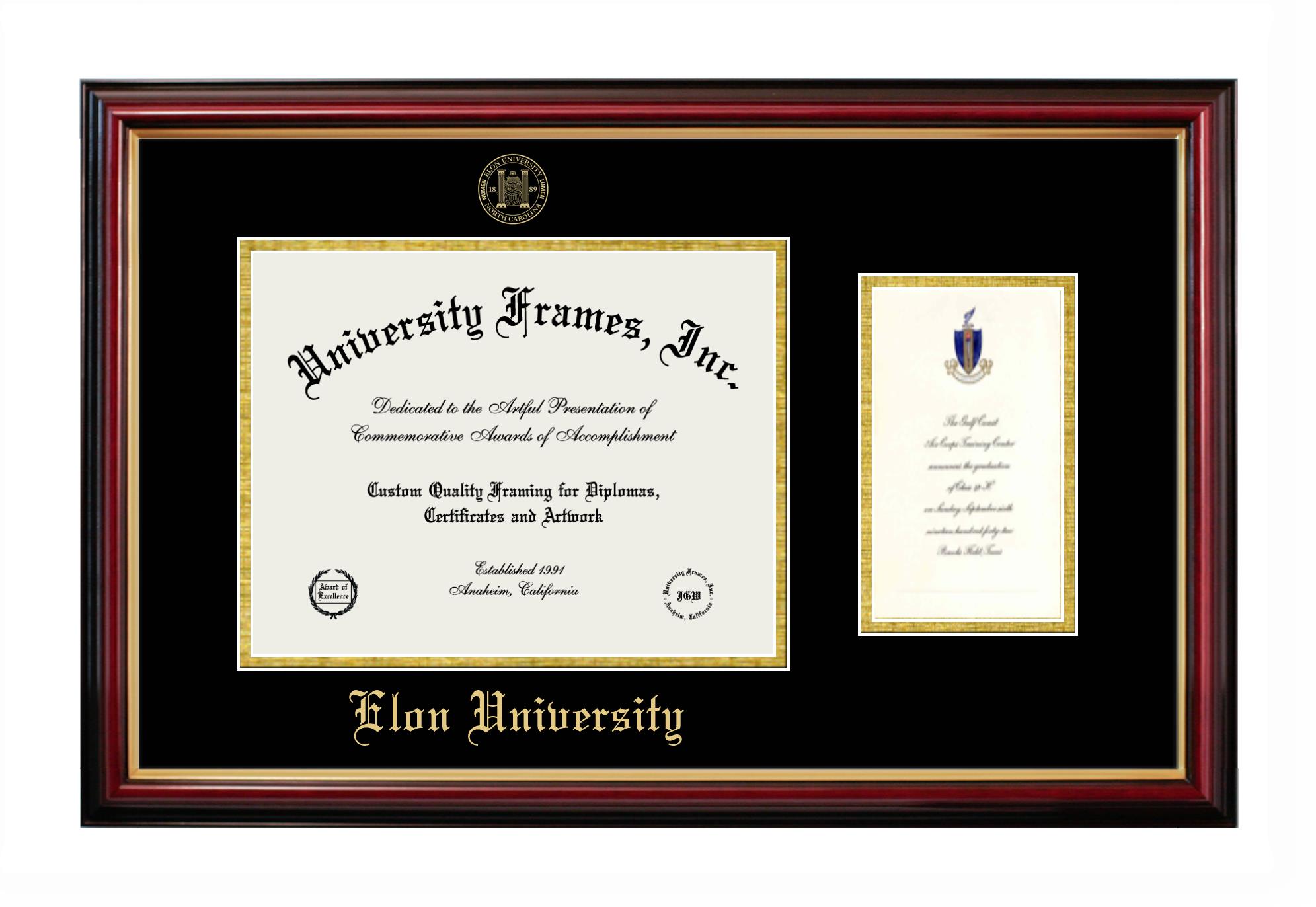 Showcase your achievement with a professional Elon University diploma frame. We offer officially licensed custom diploma frames that have the original Elon University seal. Our degree frames make great graduation gifts. All our frames are handcrafted to meet your style and preference. Each frame is carefully inspected to achieve the highest quality standards and precision. You can easily customize your college diploma frame with our online design tool. Customize your diploma frame now!