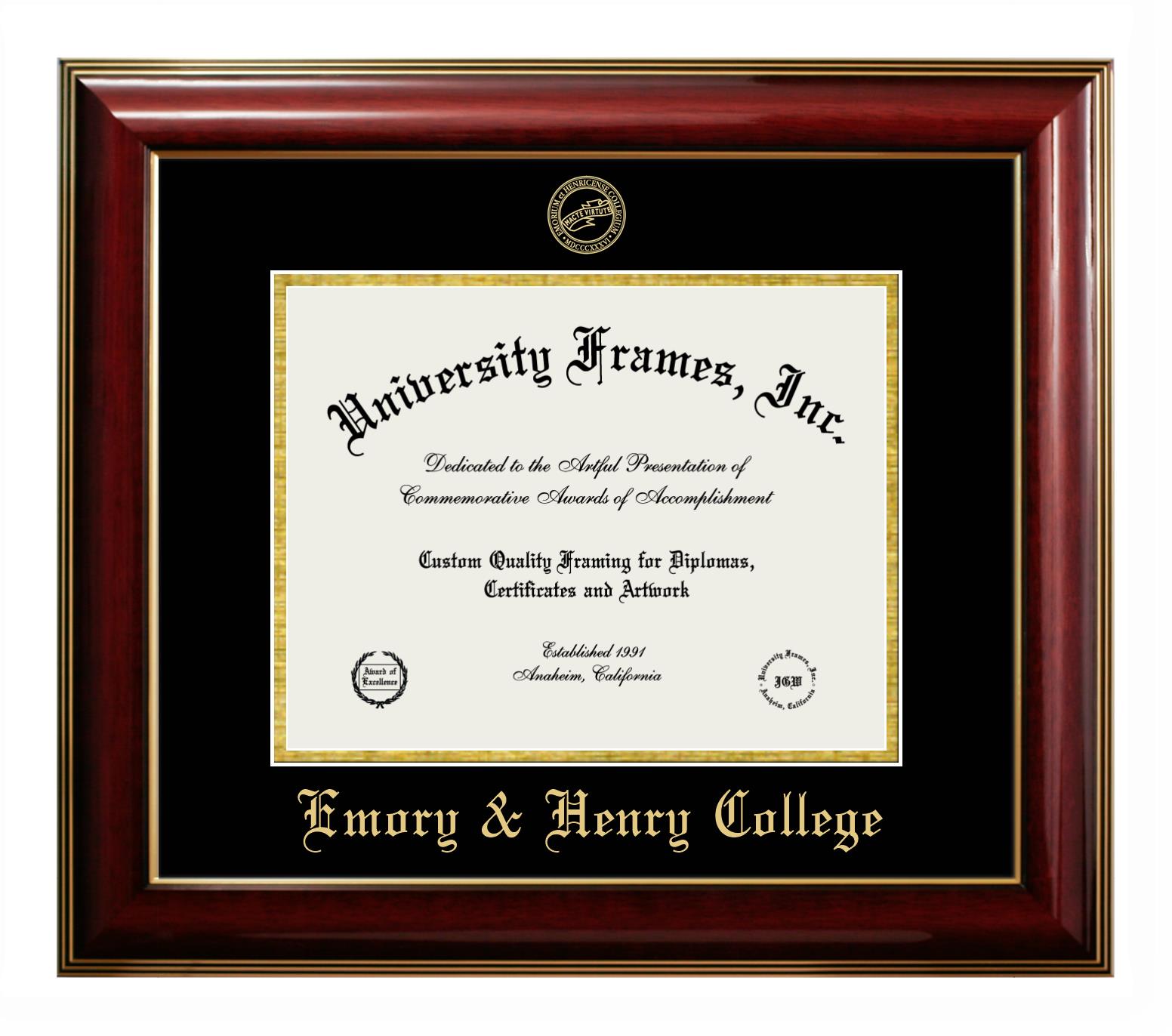 Showcase your achievement with a professional Emory & Henry College diploma frame. We offer officially licensed custom diploma frames that have the original Emory & Henry College seal. Our degree frames make great graduation gifts. All our frames are handcrafted to meet your style and preference. Each frame is carefully inspected to achieve the highest quality standards and precision. You can easily customize your college diploma frame with our online design tool. Customize your diploma frame now!