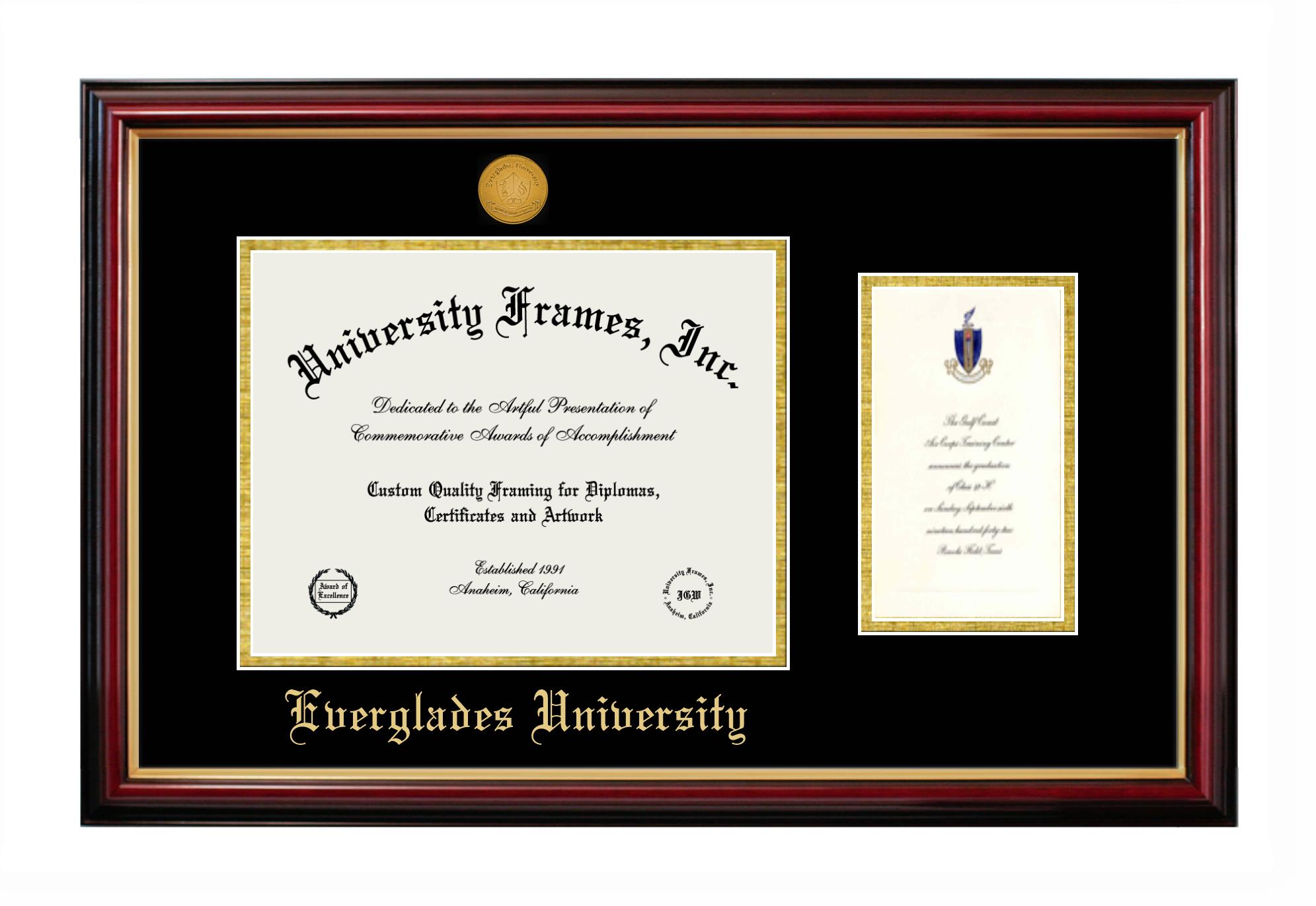 Showcase your achievement with a professional Everglades University diploma frame. We offer officially licensed custom diploma frames that have the original Everglades University seal. Our degree frames make great graduation gifts. All our frames are handcrafted to meet your style and preference. Each frame is carefully inspected to achieve the highest quality standards and precision. You can easily customize your college diploma frame with our online design tool. Customize your diploma frame now!