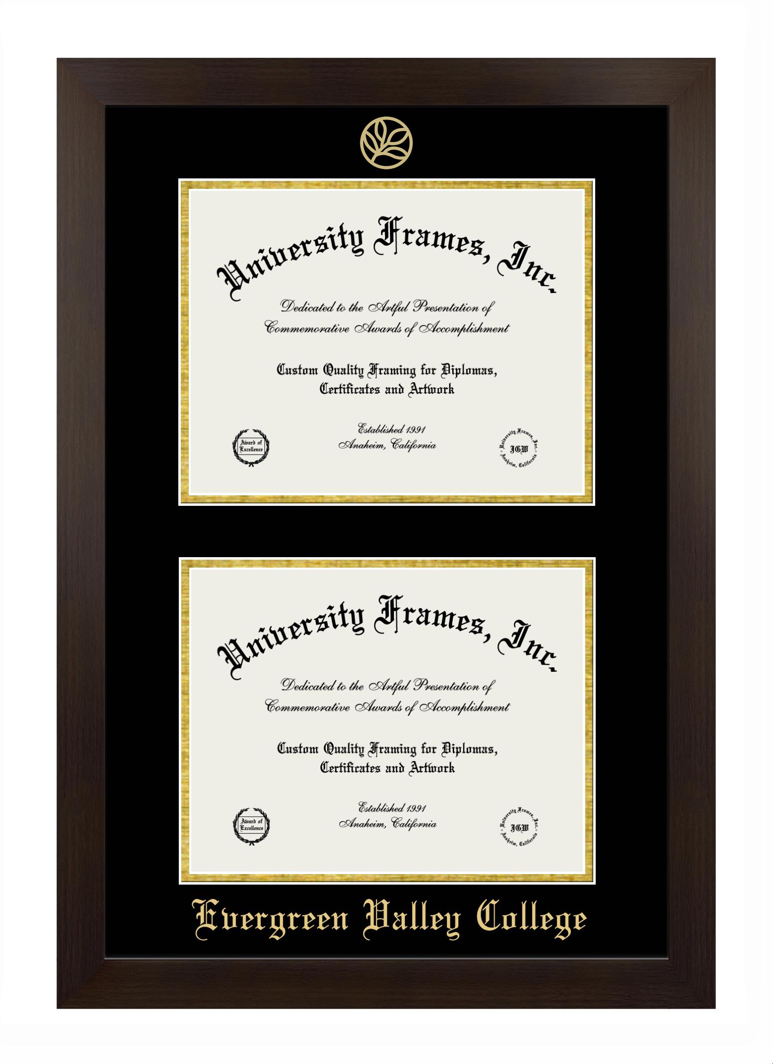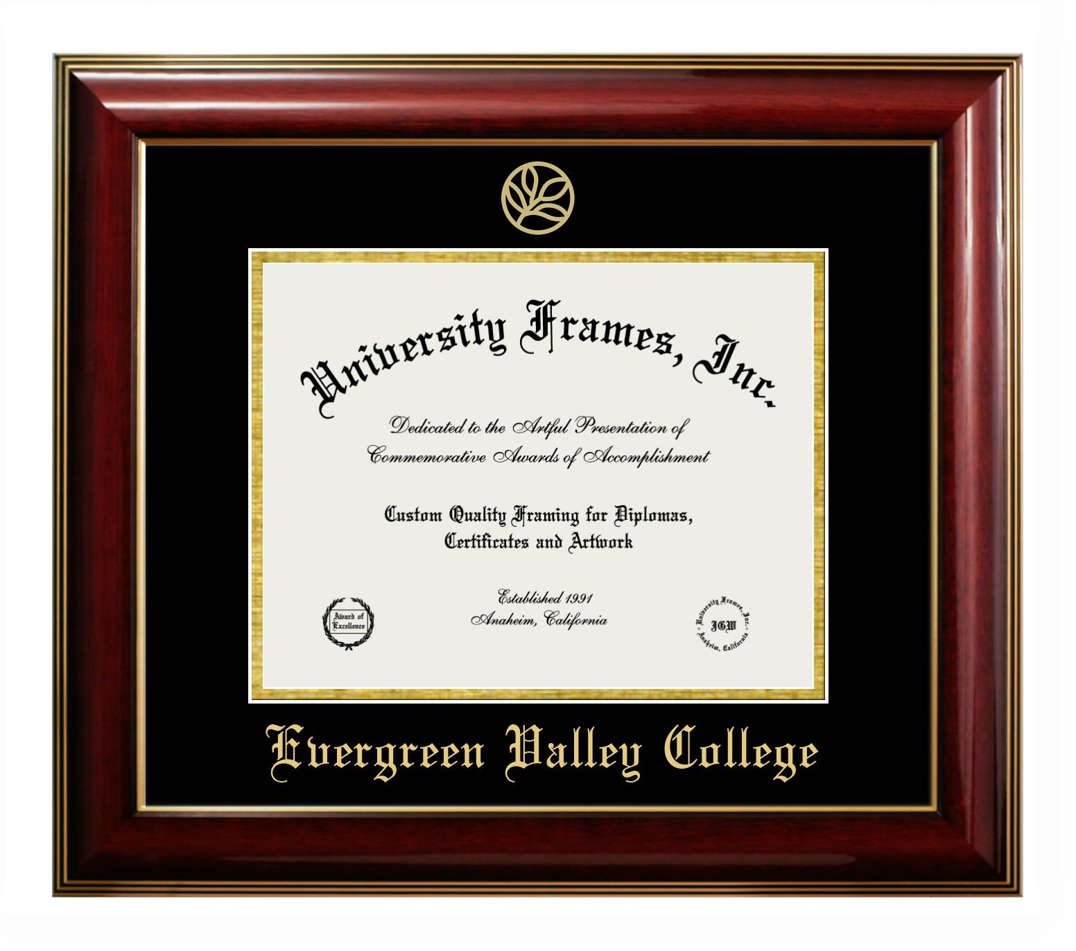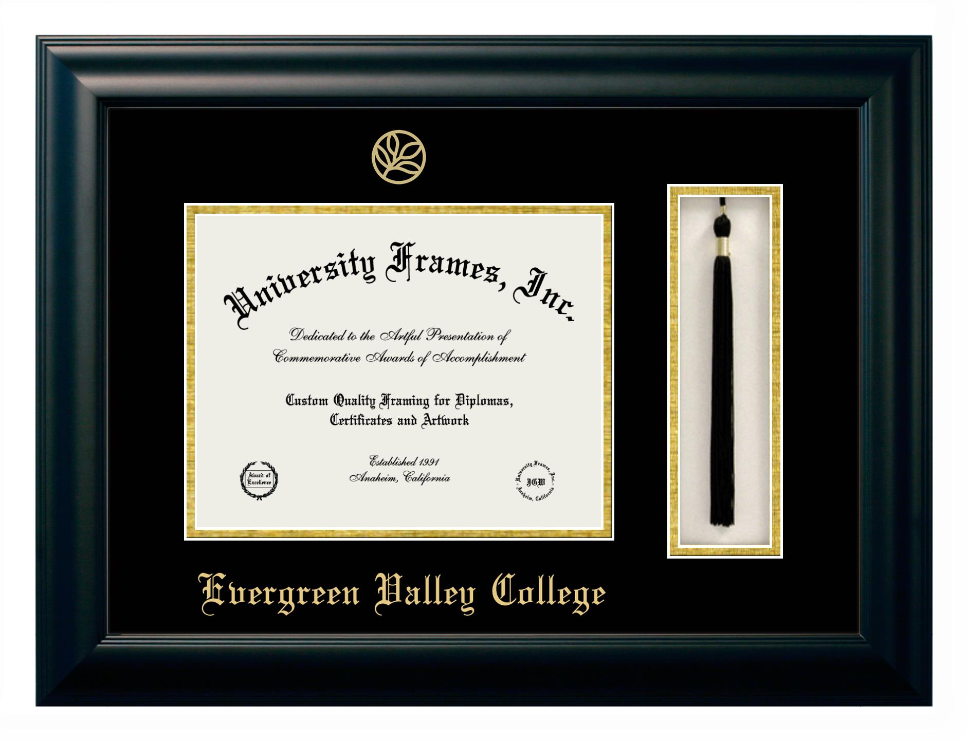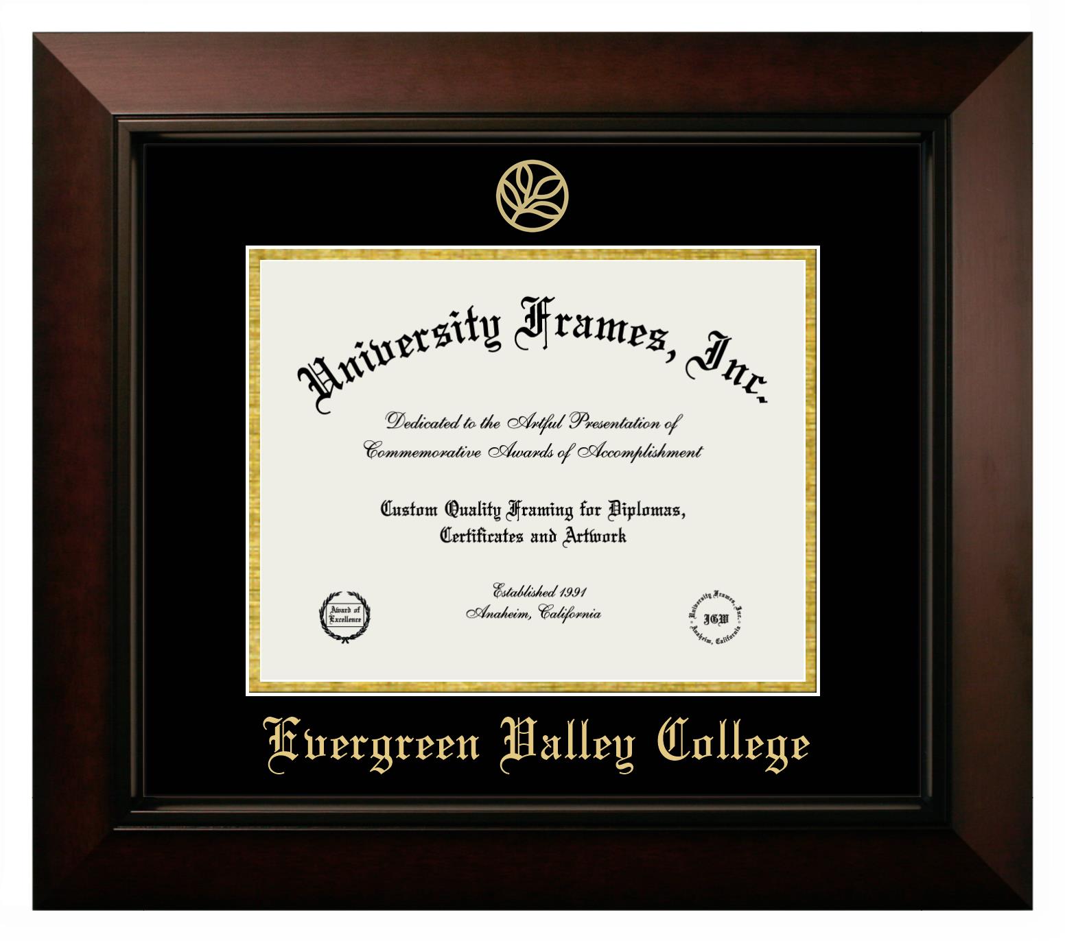 Showcase your achievement with a professional Evergreen Valley College diploma frame. We offer officially licensed custom diploma frames that have the original Evergreen Valley College seal. Our degree frames make great graduation gifts. All our frames are handcrafted to meet your style and preference. Each frame is carefully inspected to achieve the highest quality standards and precision. You can easily customize your college diploma frame with our online design tool. Customize your diploma frame now!