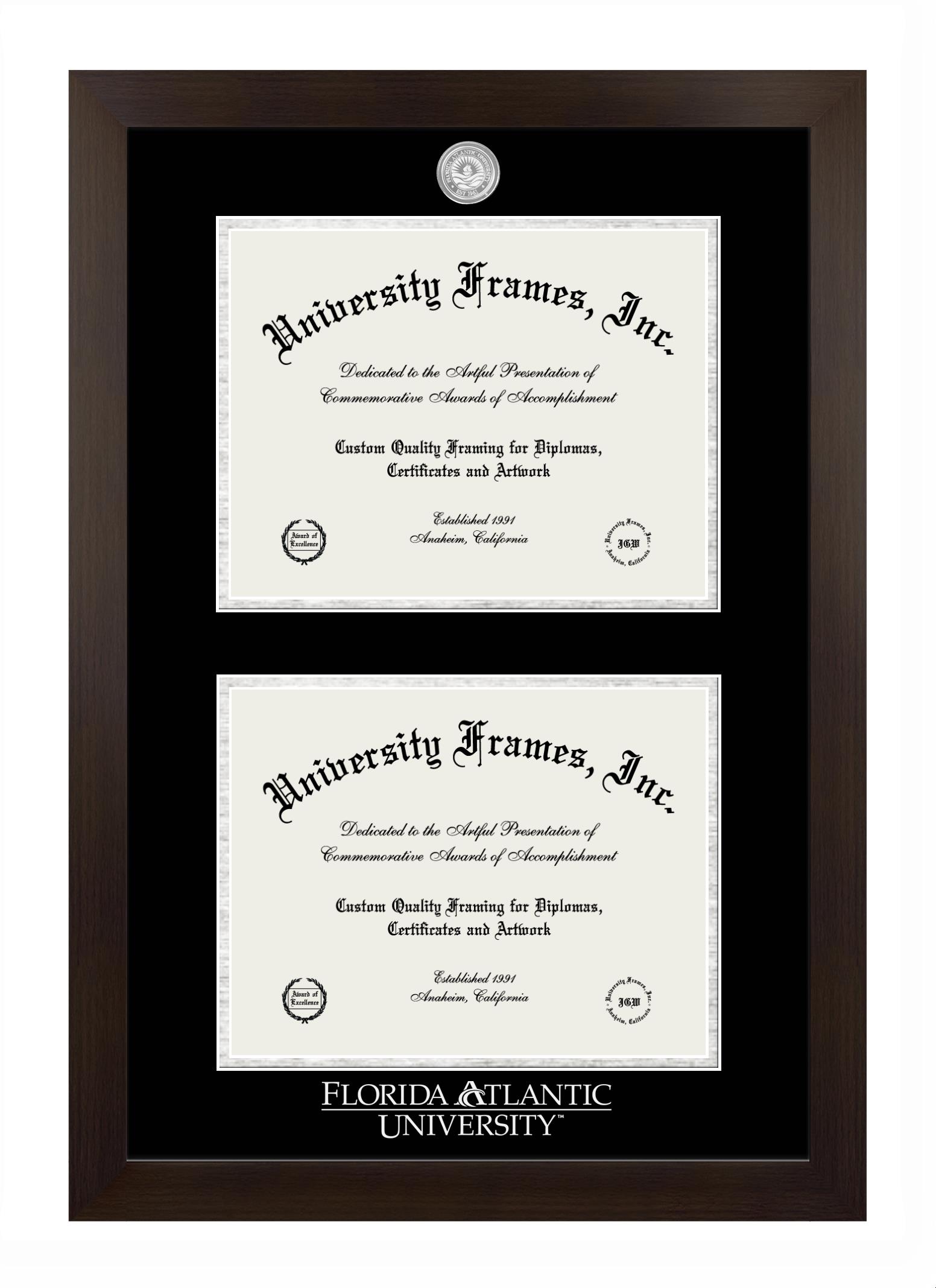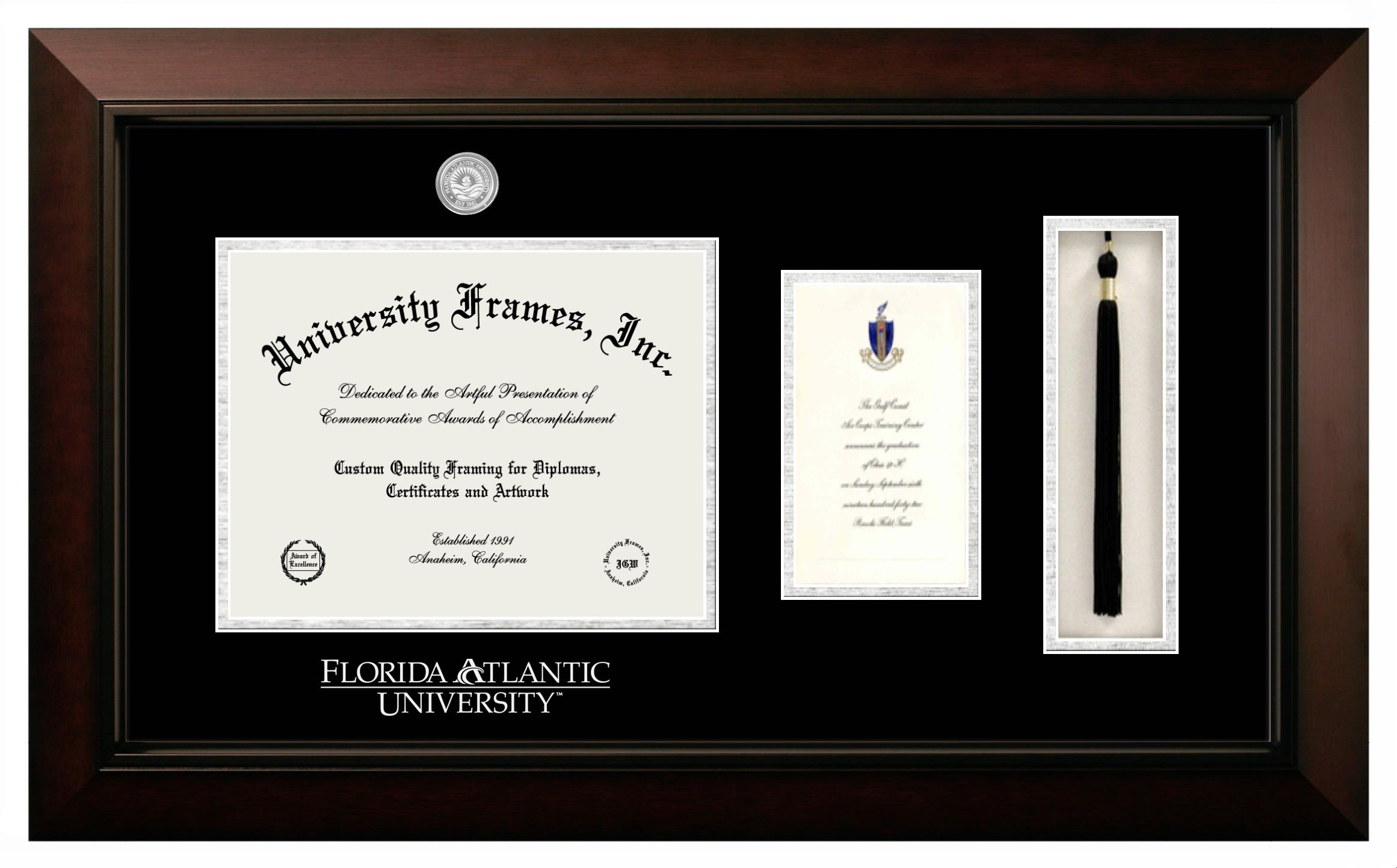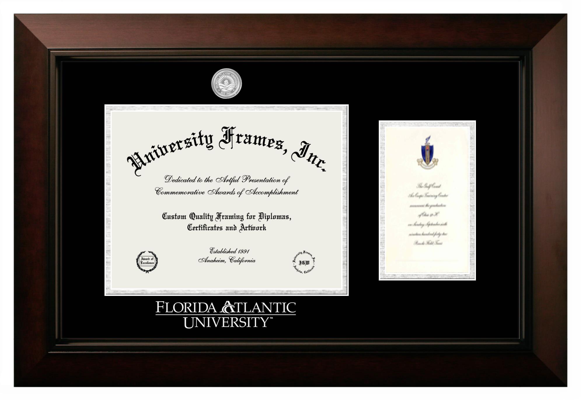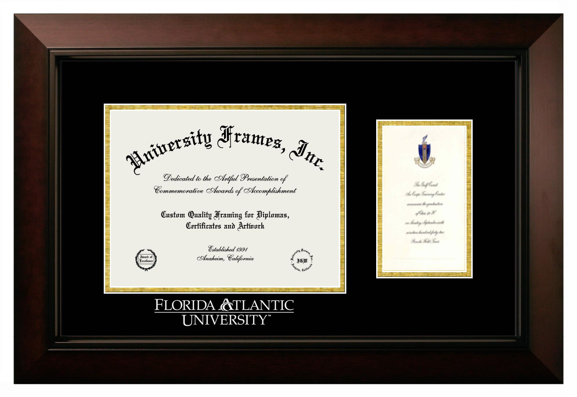 Showcase your achievement with a professional Florida Atlantic University (Boca Raton) diploma frame. We offer officially licensed custom diploma frames that have the original Florida Atlantic University (Boca Raton) seal. Our degree frames make great graduation gifts. All our frames are handcrafted to meet your style and preference. Each frame is carefully inspected to achieve the highest quality standards and precision. You can easily customize your college diploma frame with our online design tool. Customize your diploma frame now!
