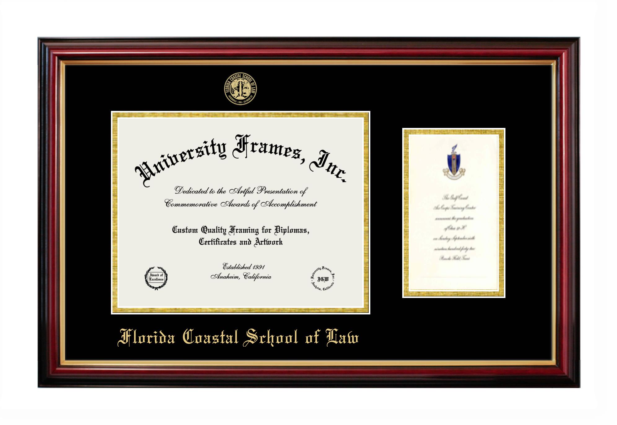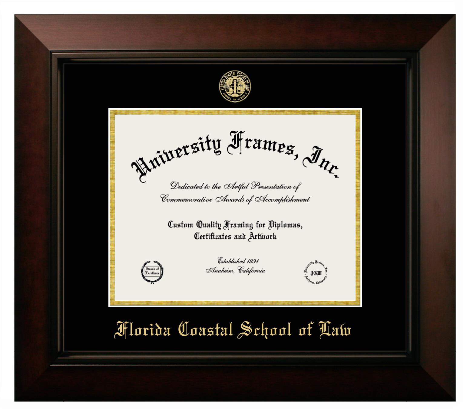 Showcase your achievement with a professional Florida Coastal School of Law diploma frame. We offer officially licensed custom diploma frames that have the original Florida Coastal School of Law seal. Our degree frames make great graduation gifts. All our frames are handcrafted to meet your style and preference. Each frame is carefully inspected to achieve the highest quality standards and precision. You can easily customize your college diploma frame with our online design tool. Customize your diploma frame now!