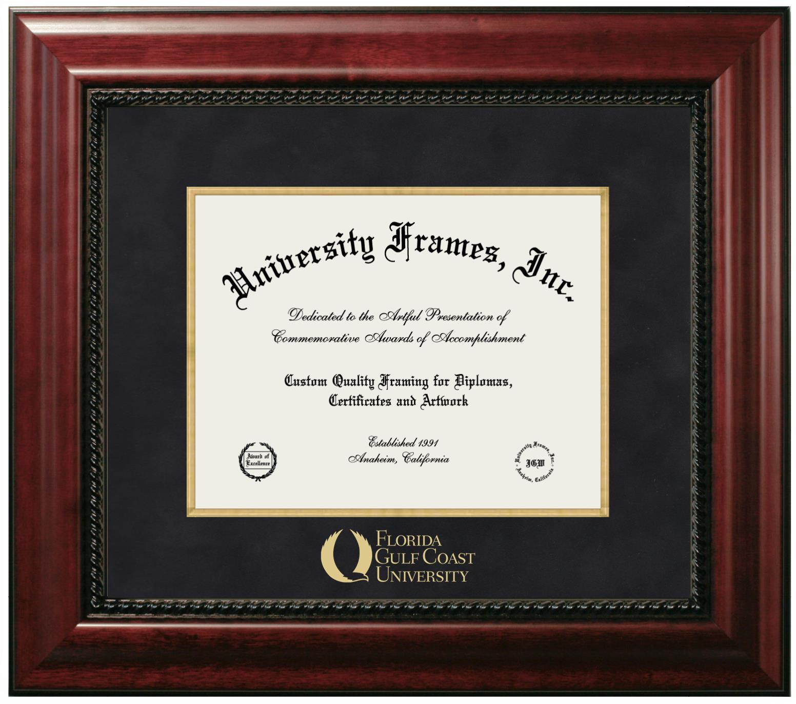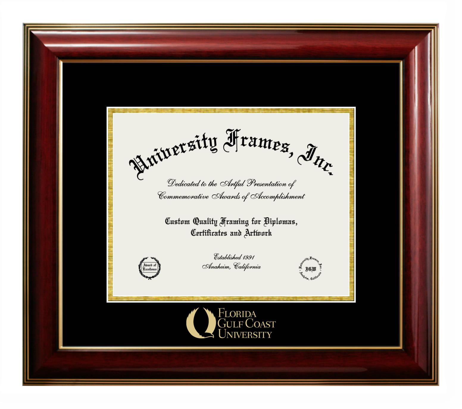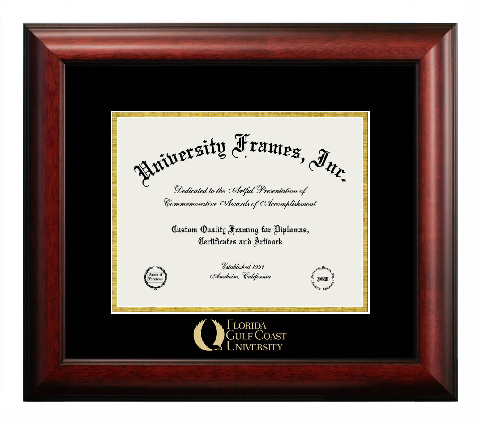Showcase your achievement with a professional Florida Gulf Coast University diploma frame. We offer officially licensed custom diploma frames that have the original Florida Gulf Coast University seal. Our degree frames make great graduation gifts. All our frames are handcrafted to meet your style and preference. Each frame is carefully inspected to achieve the highest quality standards and precision. You can easily customize your college diploma frame with our online design tool. Customize your diploma frame now!