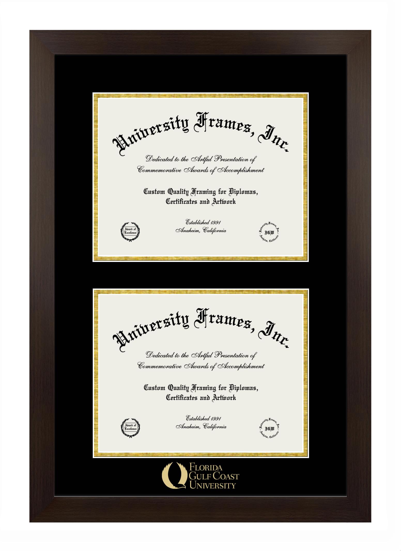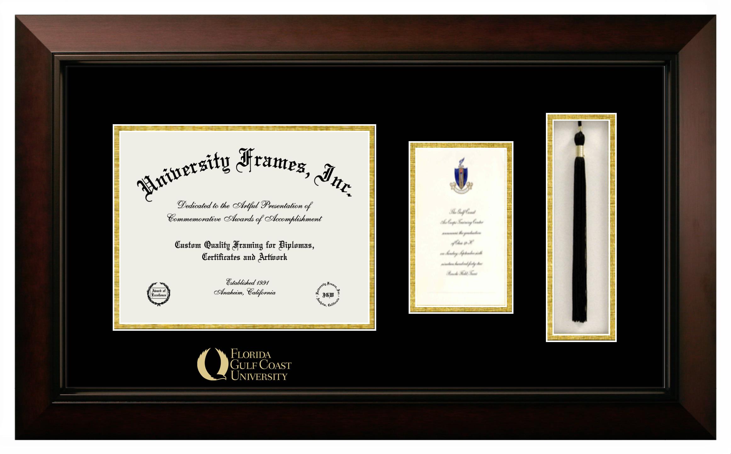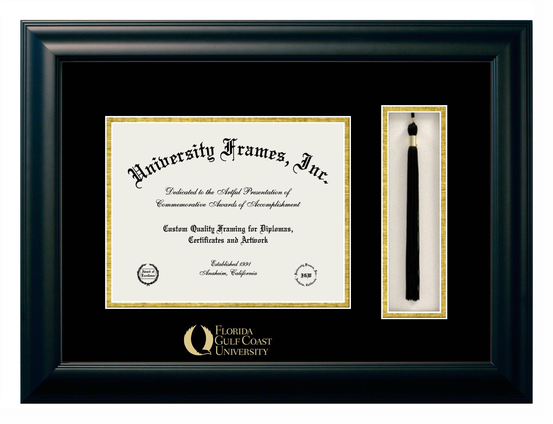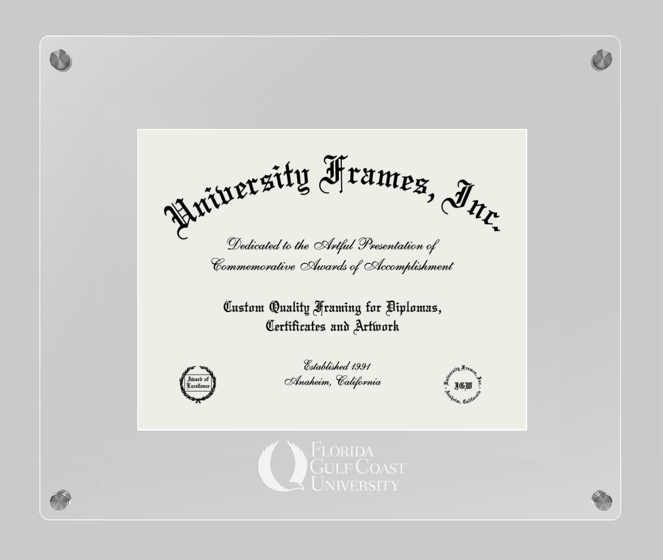 Showcase your achievement with a professional Florida Gulf Coast University diploma frame. We offer officially licensed custom diploma frames that have the original Florida Gulf Coast University seal. Our degree frames make great graduation gifts. All our frames are handcrafted to meet your style and preference. Each frame is carefully inspected to achieve the highest quality standards and precision. You can easily customize your college diploma frame with our online design tool. Customize your diploma frame now!