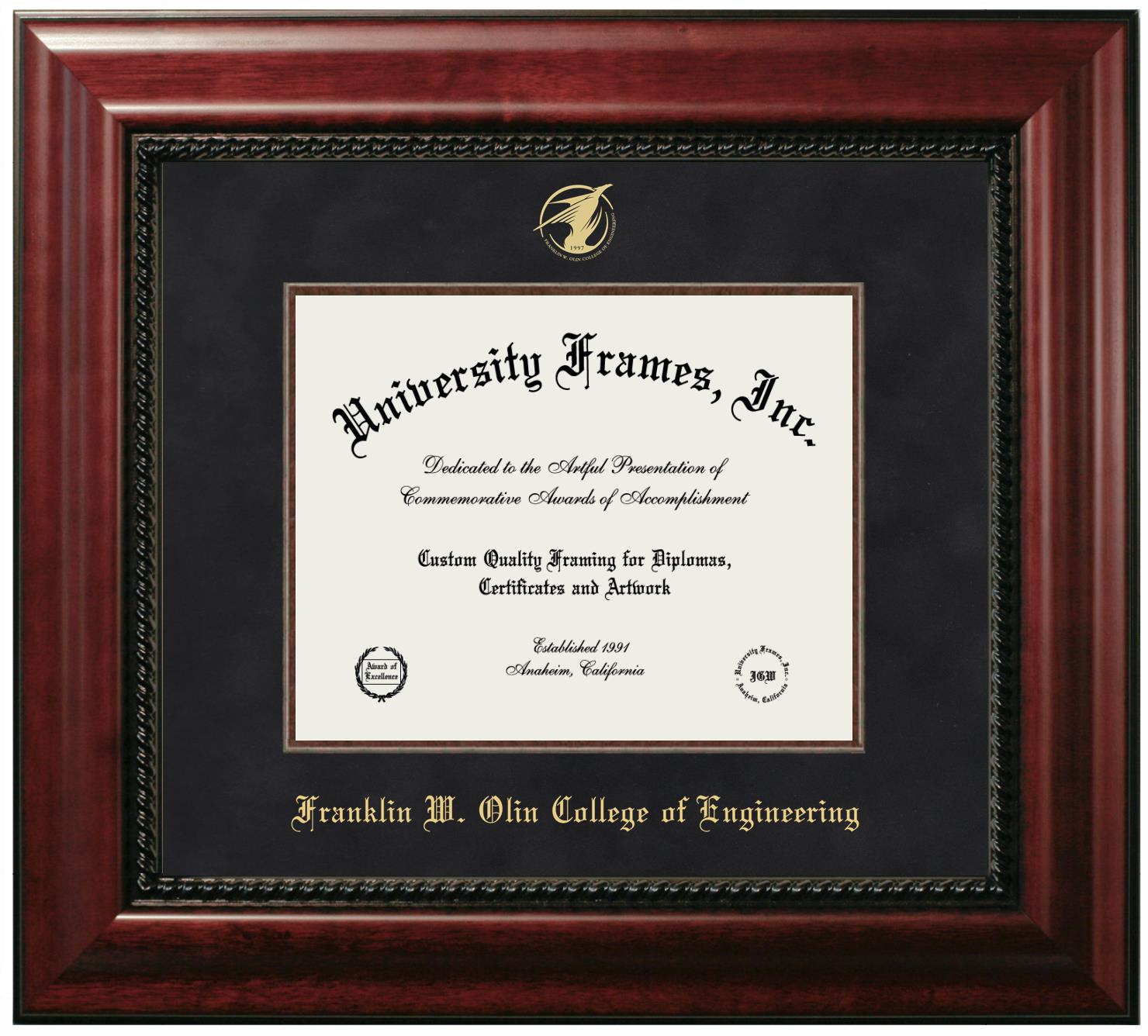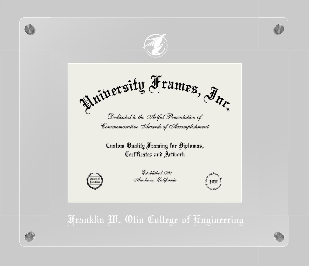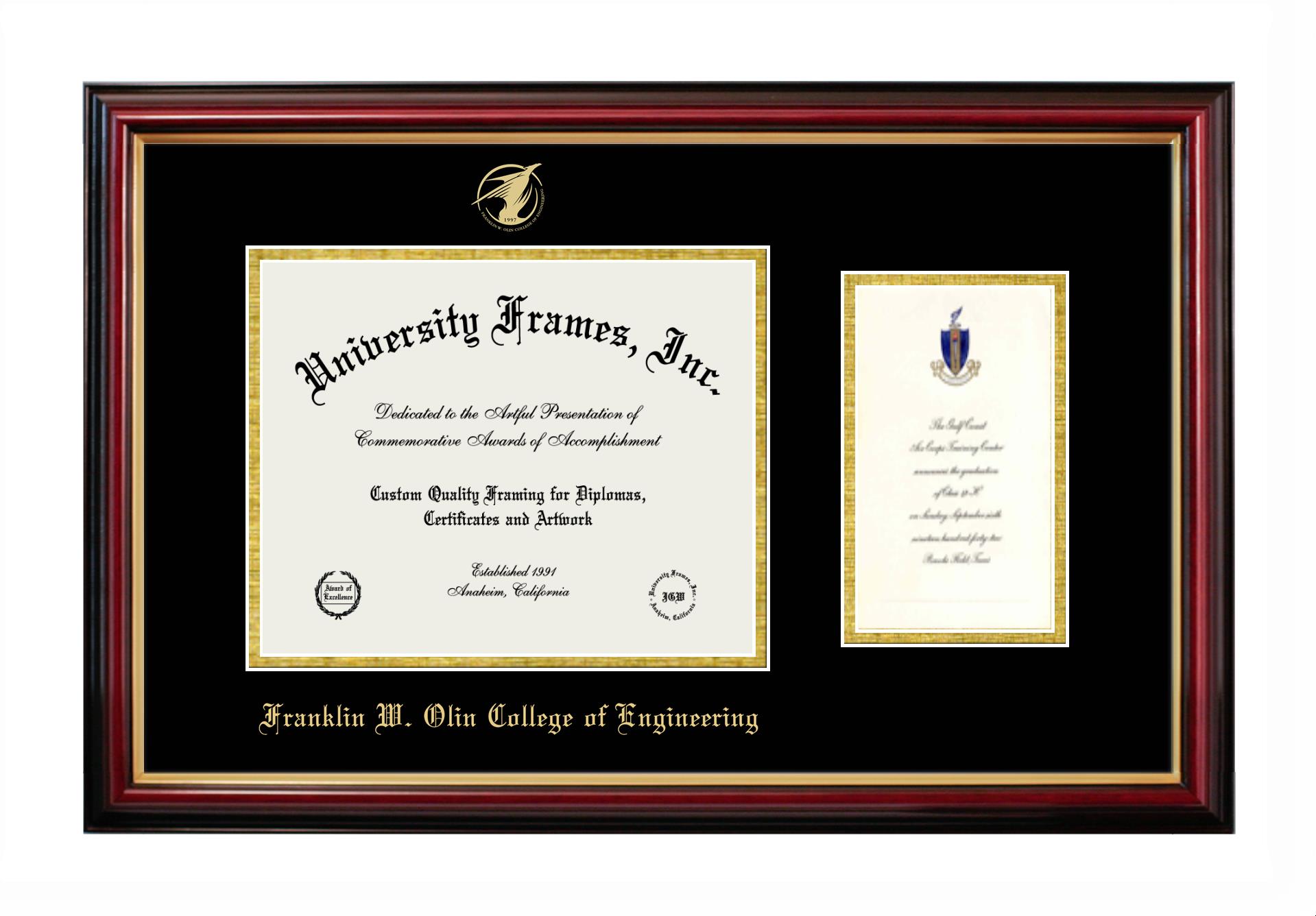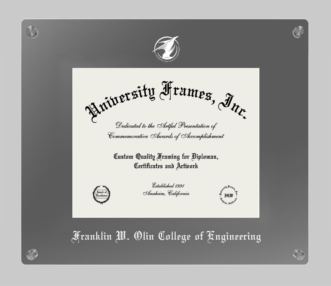 Showcase your achievement with a professional Franklin W. Olin College of Engineering diploma frame. We offer officially licensed custom diploma frames that have the original Franklin W. Olin College of Engineering seal. Our degree frames make great graduation gifts. All our frames are handcrafted to meet your style and preference. Each frame is carefully inspected to achieve the highest quality standards and precision. You can easily customize your college diploma frame with our online design tool. Customize your diploma frame now!