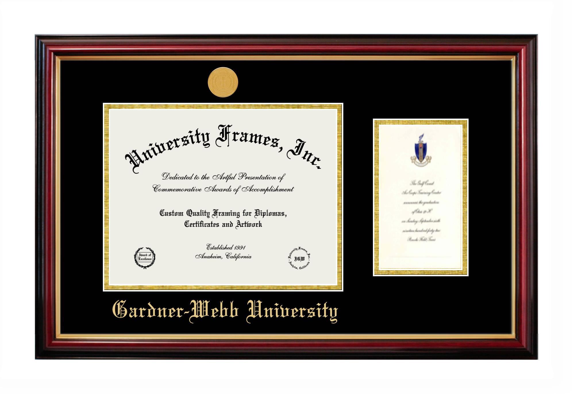 Showcase your achievement with a professional Gardner-Webb University diploma frame. We offer officially licensed custom diploma frames that have the original Gardner-Webb University seal. Our degree frames make great graduation gifts. All our frames are handcrafted to meet your style and preference. Each frame is carefully inspected to achieve the highest quality standards and precision. You can easily customize your college diploma frame with our online design tool. Customize your diploma frame now!