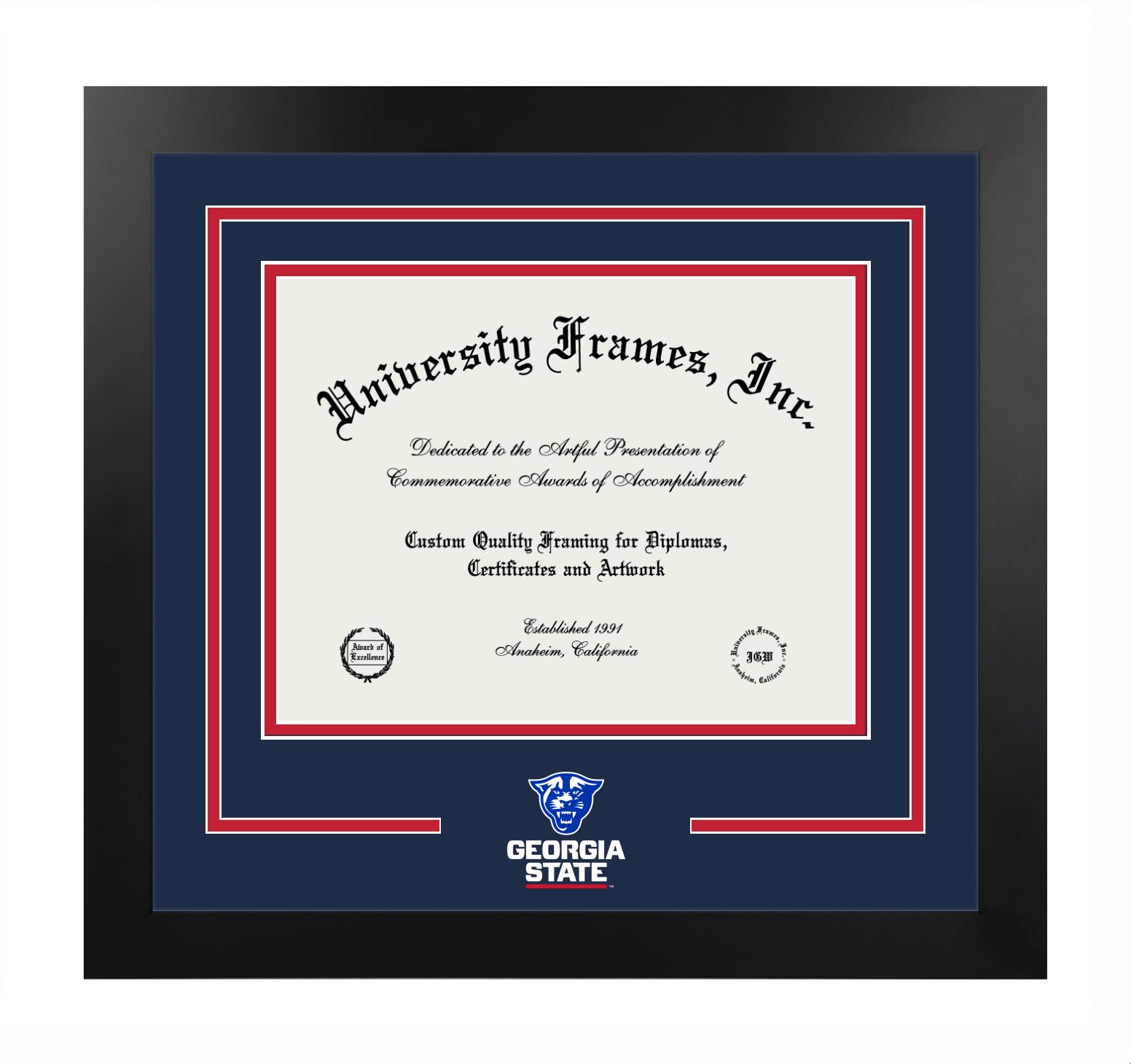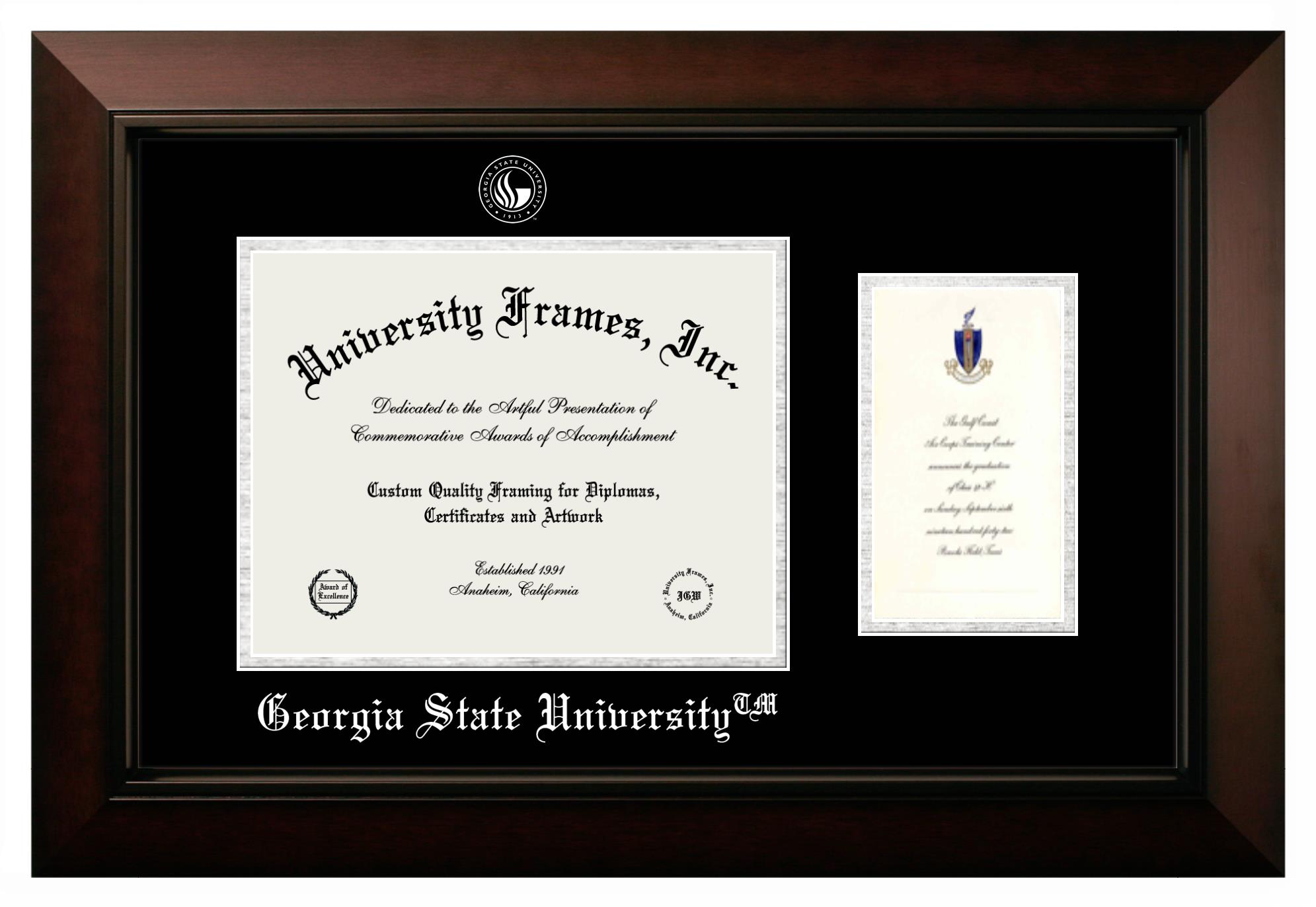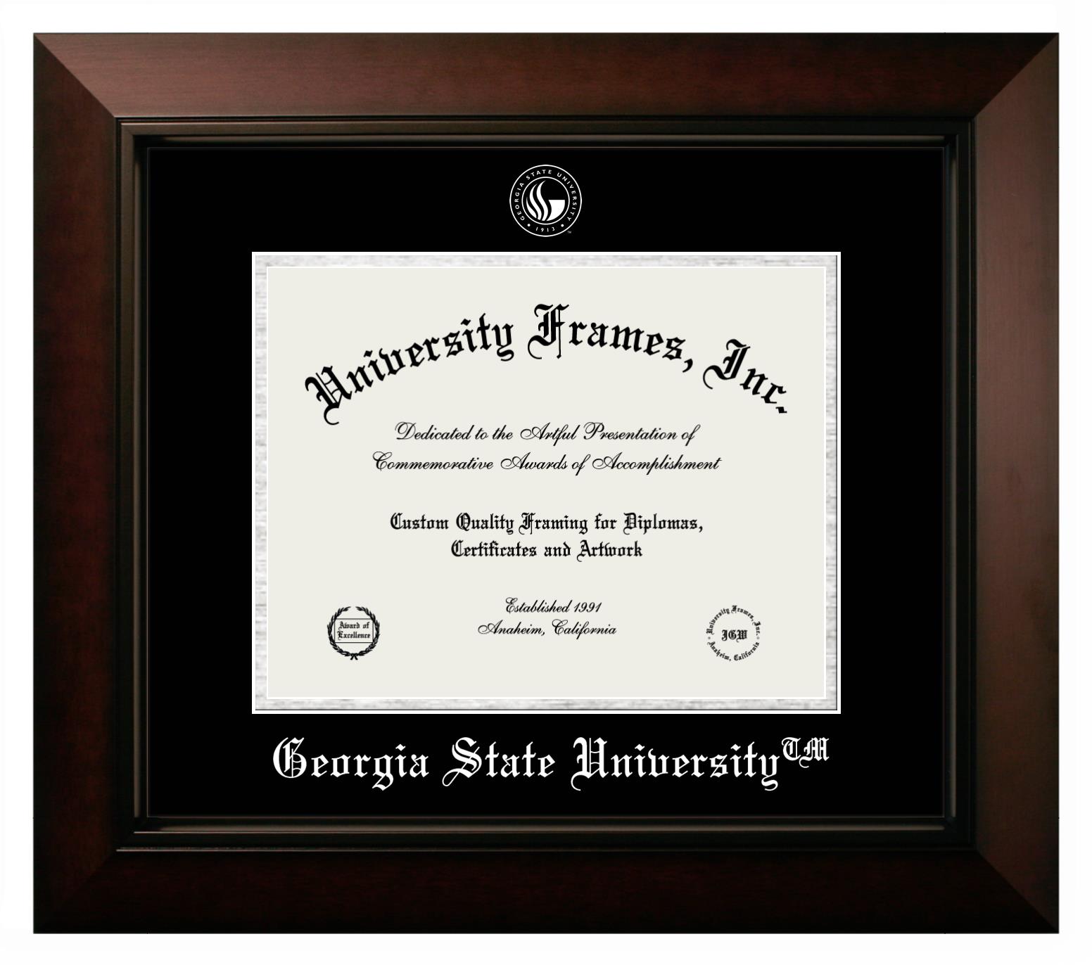 Showcase your achievement with a professional Georgia State University diploma frame. We offer officially licensed custom diploma frames that have the original Georgia State University seal. Our degree frames make great graduation gifts. All our frames are handcrafted to meet your style and preference. Each frame is carefully inspected to achieve the highest quality standards and precision. You can easily customize your college diploma frame with our online design tool. Customize your diploma frame now!