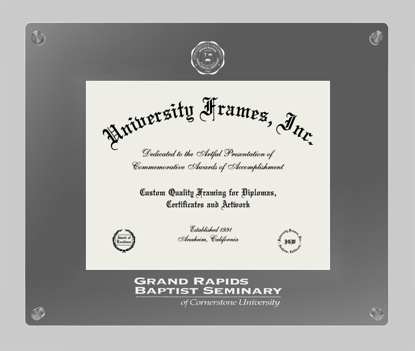 Showcase your achievement with a professional Grand Rapids Baptist Seminary Of Cornerstone University diploma frame. We offer officially licensed custom diploma frames that have the original Grand Rapids Baptist Seminary Of Cornerstone University seal. Our degree frames make great graduation gifts. All our frames are handcrafted to meet your style and preference. Each frame is carefully inspected to achieve the highest quality standards and precision. You can easily customize your college diploma frame with our online design tool. Customize your diploma frame now!