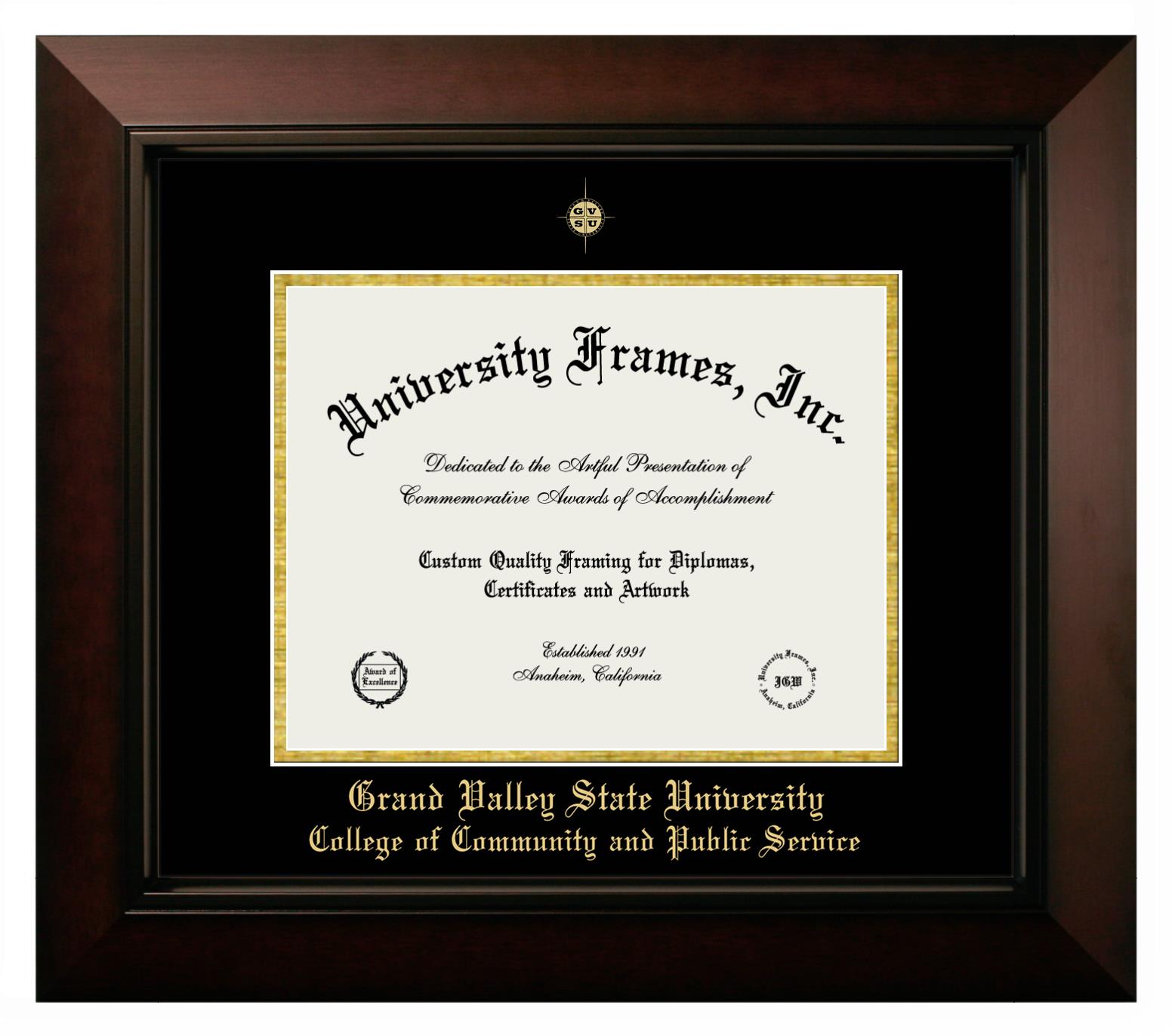 Showcase your achievement with a professional Grand Valley State University College of Community and Public Service diploma frame. We offer officially licensed custom diploma frames that have the original Grand Valley State University College of Community and Public Service seal. Our degree frames make great graduation gifts. All our frames are handcrafted to meet your style and preference. Each frame is carefully inspected to achieve the highest quality standards and precision. You can easily customize your college diploma frame with our online design tool. Customize your diploma frame now!