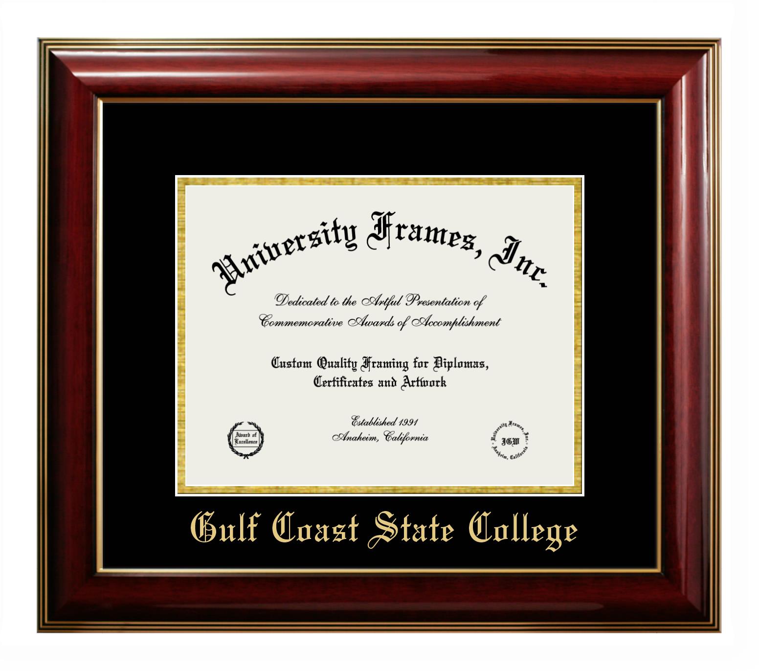 Showcase your achievement with a professional Gulf Coast State College diploma frame. We offer officially licensed custom diploma frames that have the original Gulf Coast State College seal. Our degree frames make great graduation gifts. All our frames are handcrafted to meet your style and preference. Each frame is carefully inspected to achieve the highest quality standards and precision. You can easily customize your college diploma frame with our online design tool. Customize your diploma frame now!