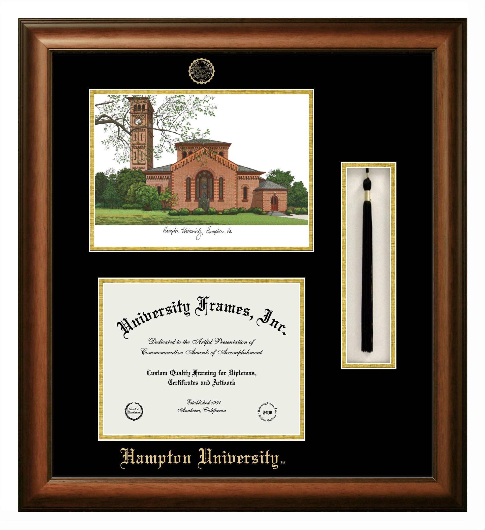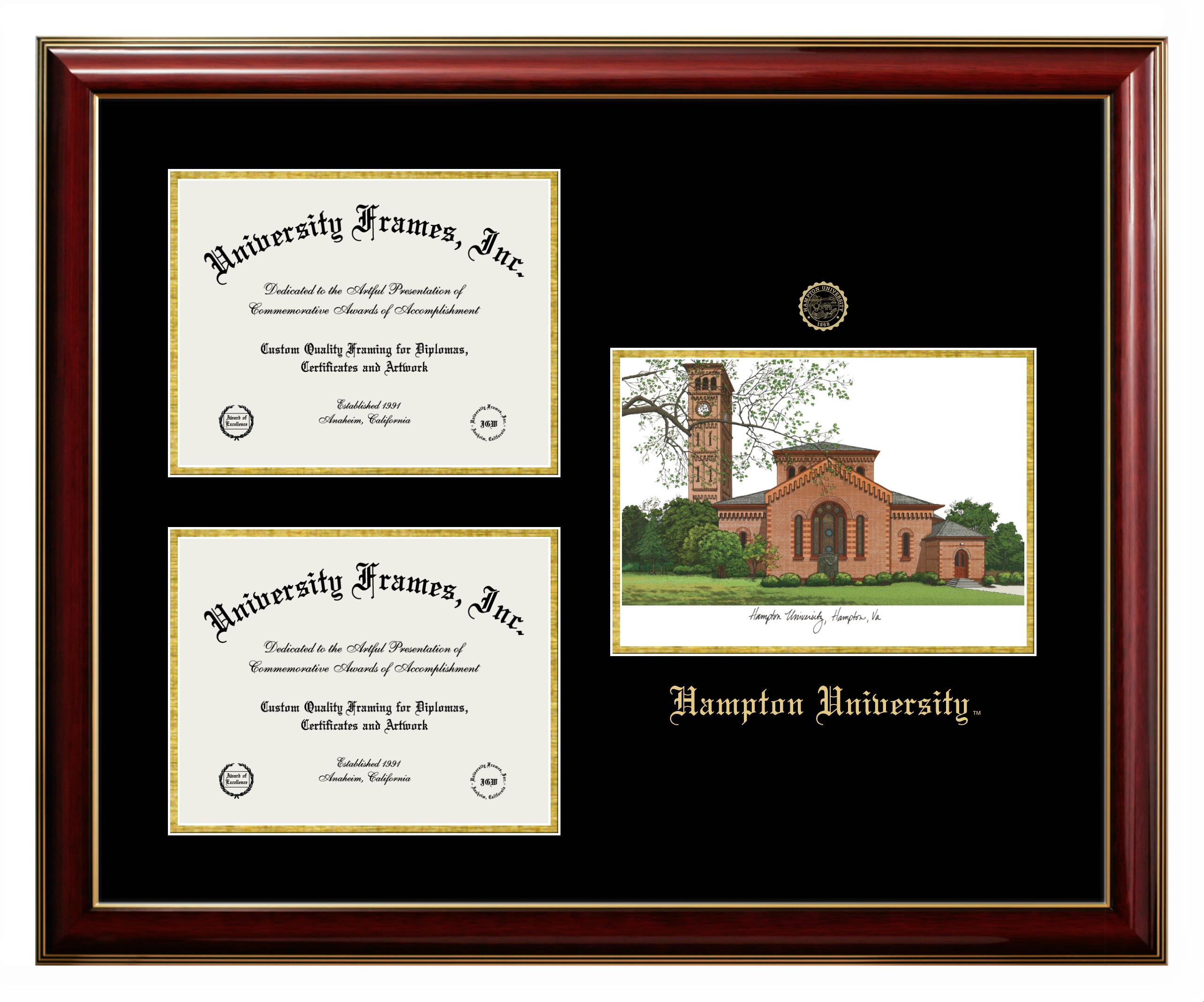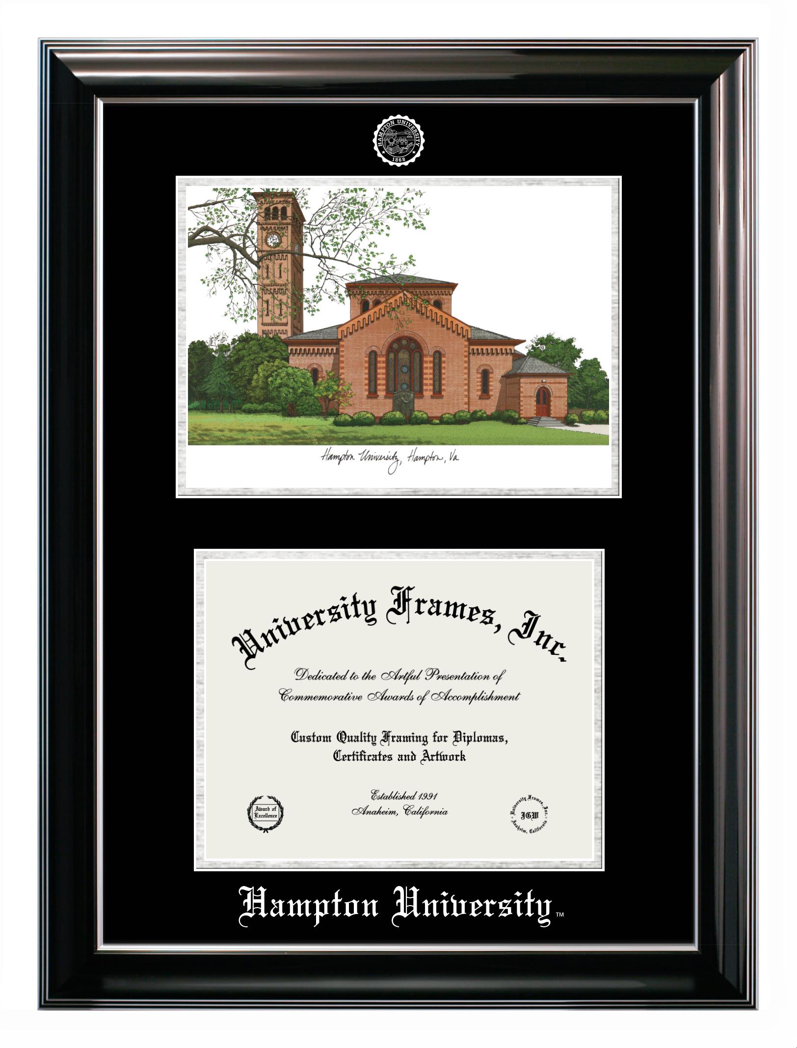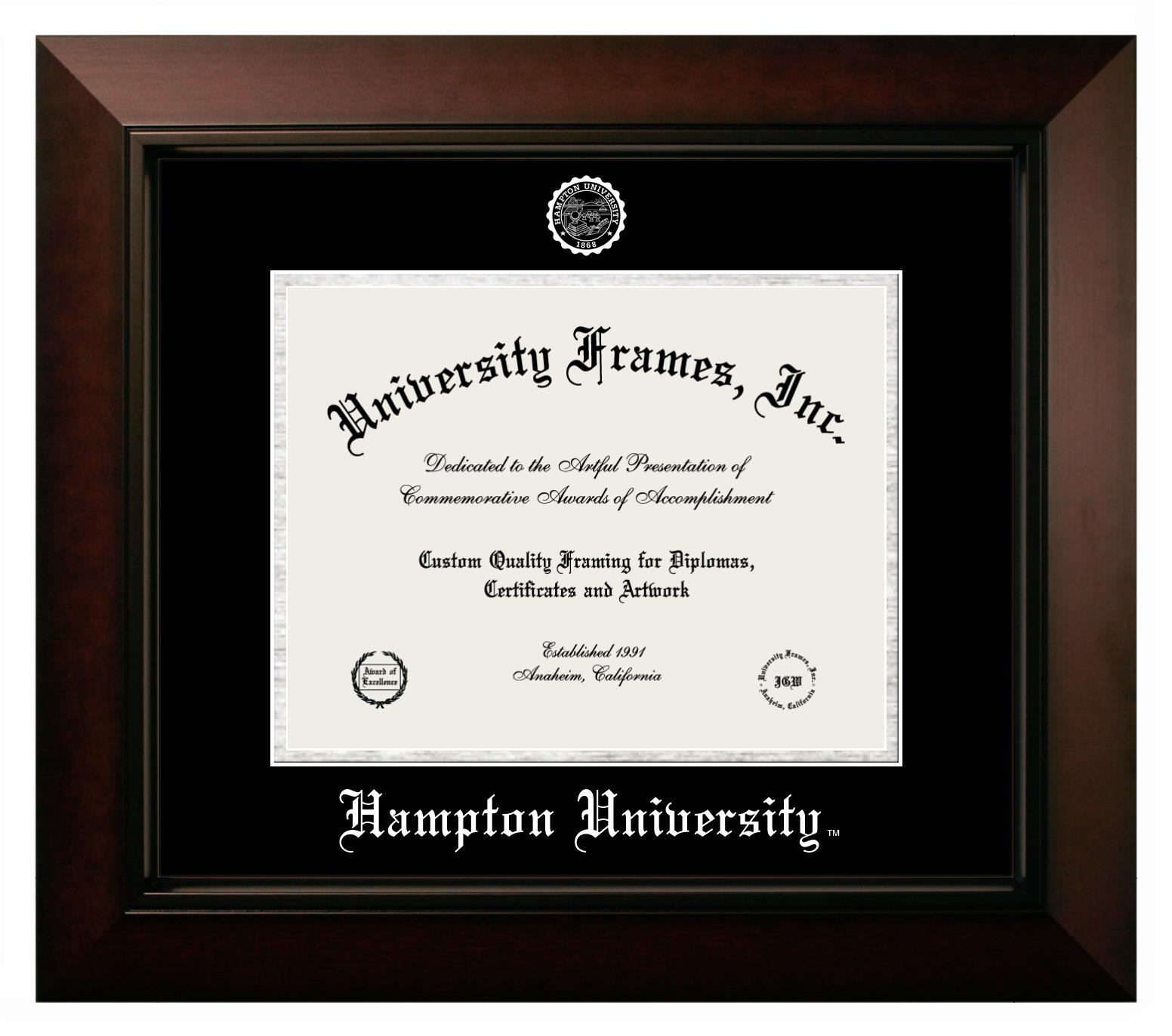 Showcase your achievement with a professional Hampton University diploma frame. We offer officially licensed custom diploma frames that have the original Hampton University seal. Our degree frames make great graduation gifts. All our frames are handcrafted to meet your style and preference. Each frame is carefully inspected to achieve the highest quality standards and precision. You can easily customize your college diploma frame with our online design tool. Customize your diploma frame now!