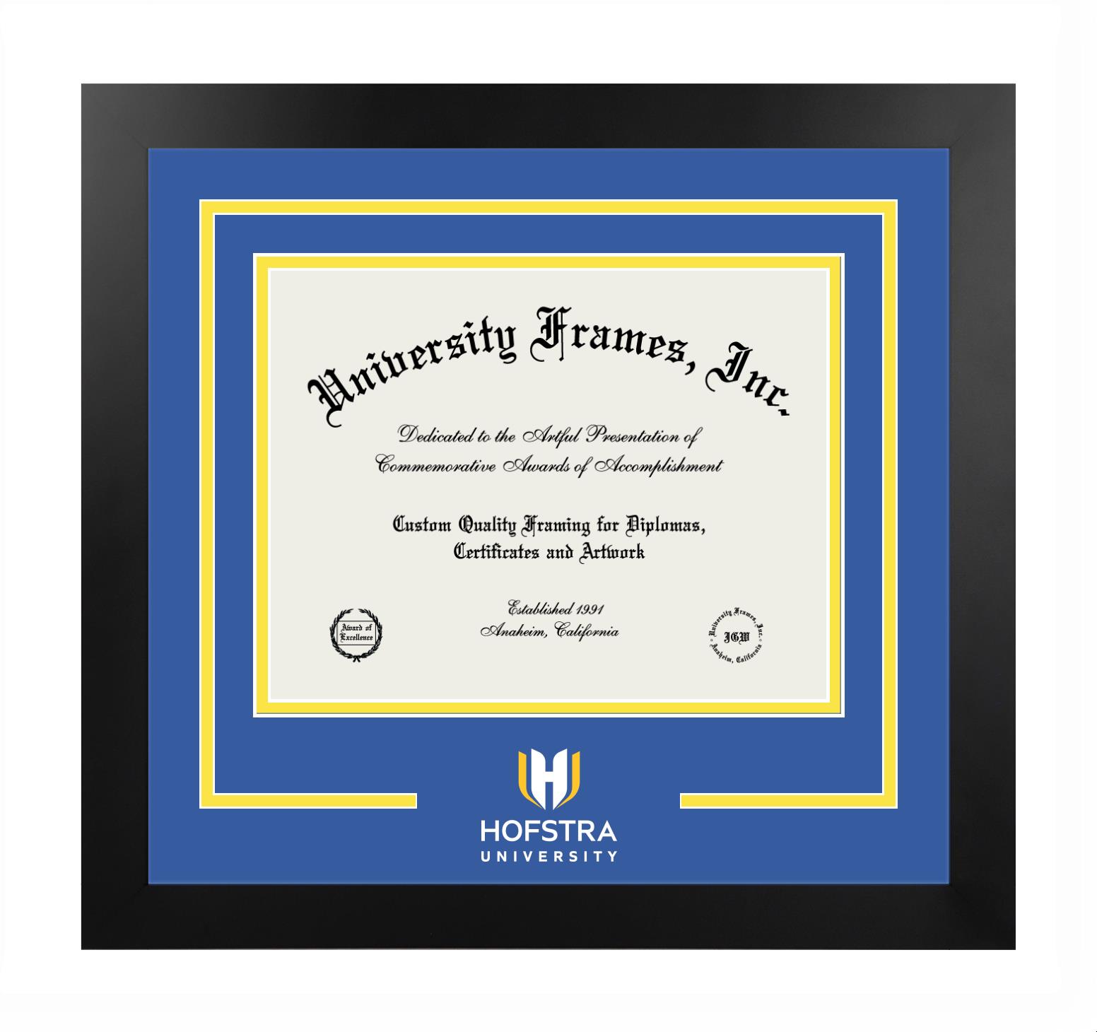 Showcase your achievement with a professional Hofstra University diploma frame. We offer officially licensed custom diploma frames that have the original Hofstra University seal. Our degree frames make great graduation gifts. All our frames are handcrafted to meet your style and preference. Each frame is carefully inspected to achieve the highest quality standards and precision. You can easily customize your college diploma frame with our online design tool. Customize your diploma frame now!