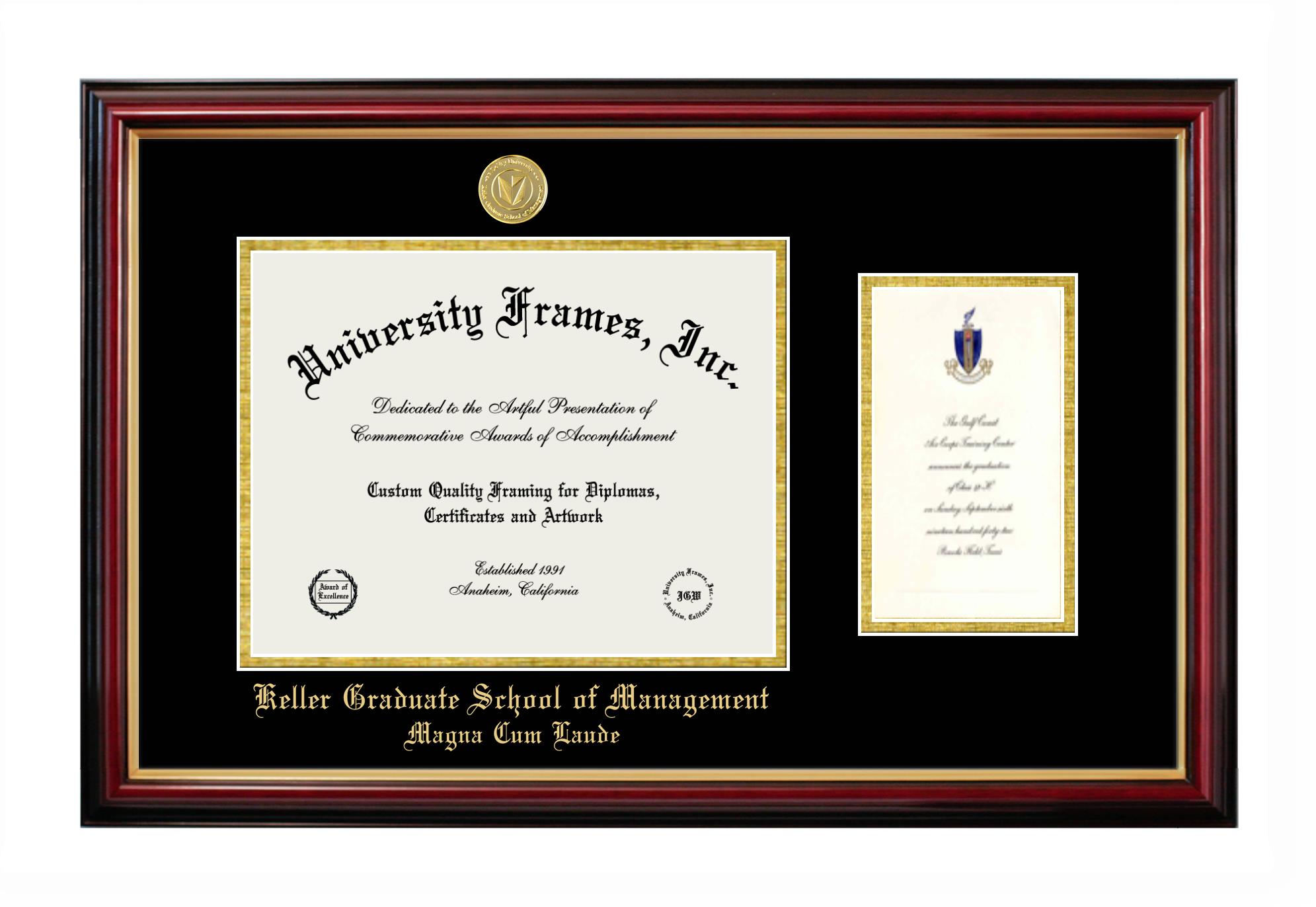 Hey there, Keller Graduate School of Management Magna Cum Laude grads. Congratulations for your accomplishment! Since you’re here, you must be looking for a professional graduation frame to preserve and showcase your Keller Graduate School of Management Magna Cum Laude diploma. Or, you may be looking for a diploma frame for another grad. We at University Frames, create the finest diploma frames and are licensed with Keller Graduate School of Management Magna Cum Laude. Each of our degree frames is handcrafted in the US using the finest hardwood and with an exemplary level of attention to detail. Customize your diploma frame using our easy and intuitive online design tool.
