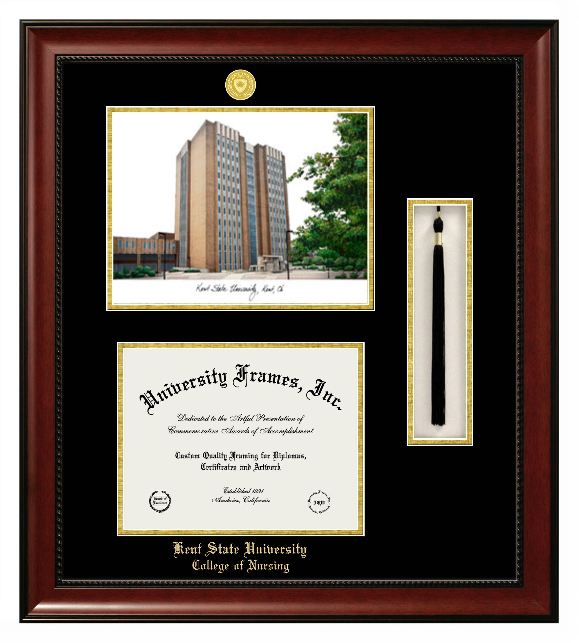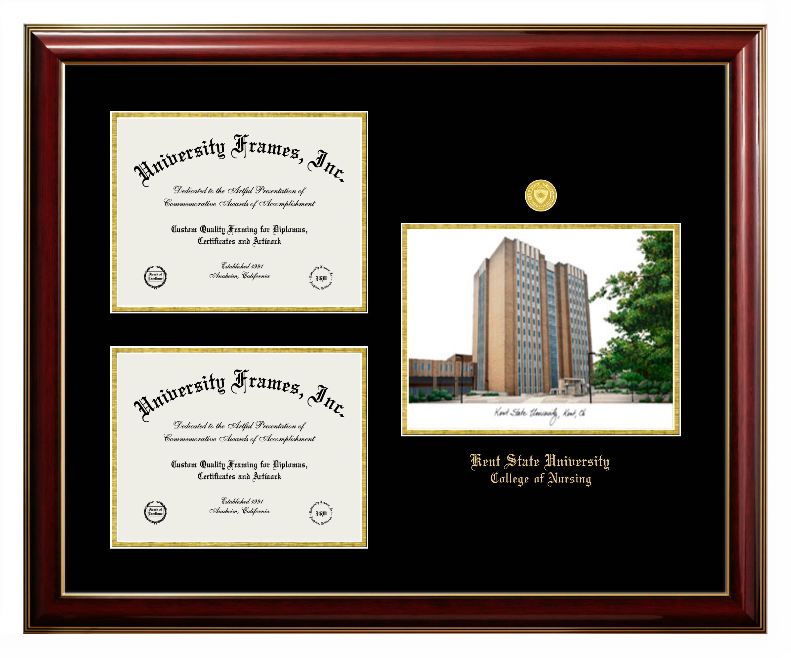 Hey there, Kent State University College of Nursing grads. Congratulations for your accomplishment! Since youโre here, you must be looking for a professional graduation frame to preserve and showcase your Kent State University College of Nursing diploma. Or, you may be looking for a diploma frame for another grad. We at University Frames, create the finest diploma frames and are licensed with Kent State University College of Nursing. Each of our degree frames is handcrafted in the US using the finest hardwood and with an exemplary level of attention to detail. Customize your diploma frame using our easy and intuitive online design tool.