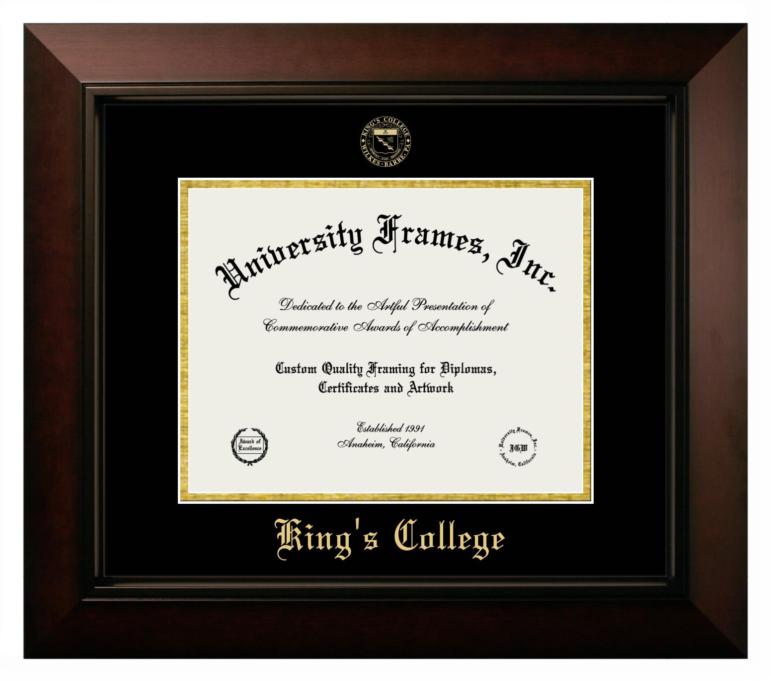 Hey there, King's College (Wilkes-Barre) grads. Congratulations for your accomplishment! Since you’re here, you must be looking for a professional graduation frame to preserve and showcase your King's College (Wilkes-Barre) diploma. Or, you may be looking for a diploma frame for another grad. We at University Frames, create the finest diploma frames and are licensed with King's College (Wilkes-Barre). Each of our degree frames is handcrafted in the US using the finest hardwood and with an exemplary level of attention to detail. Customize your diploma frame using our easy and intuitive online design tool.