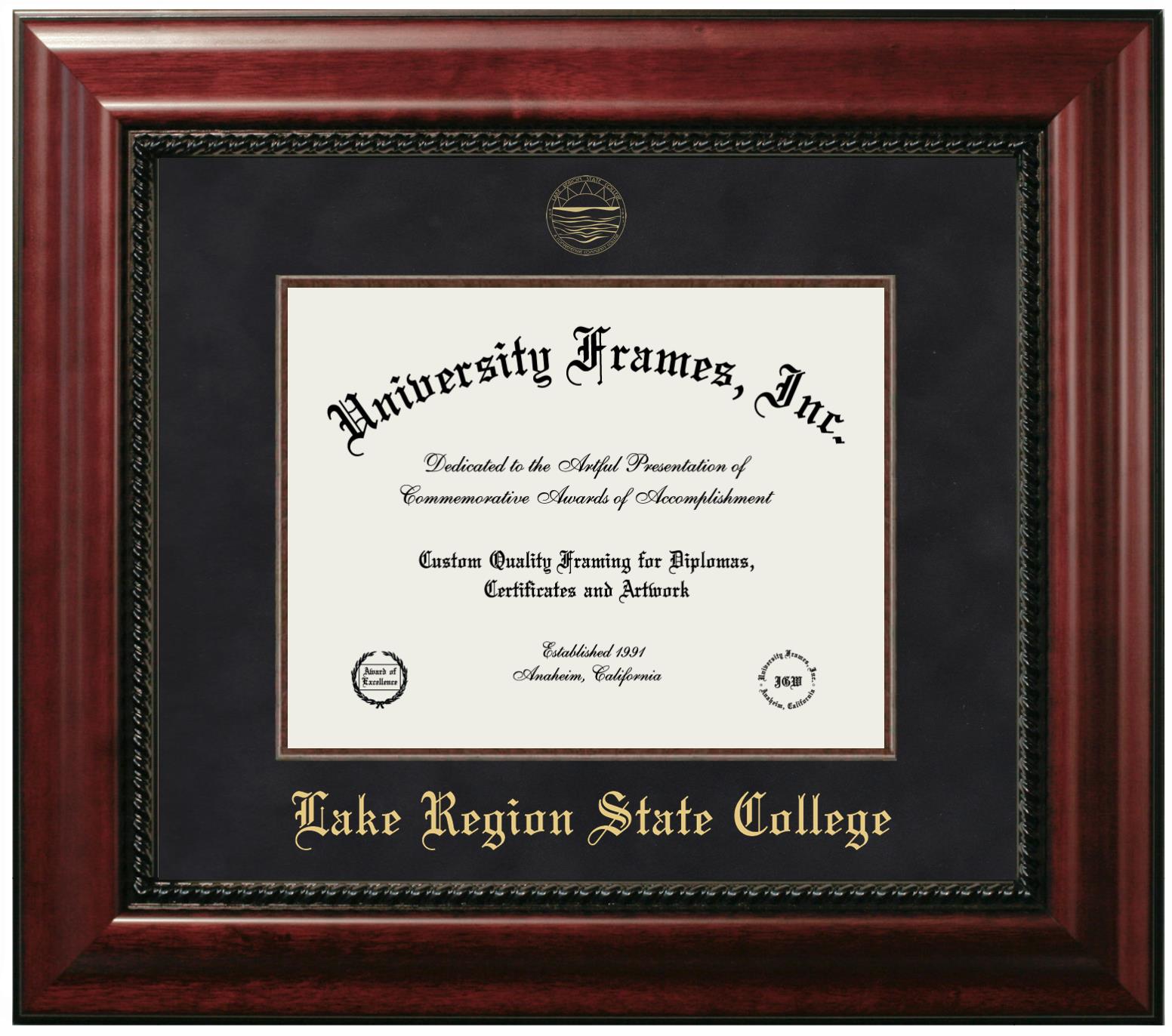 Hey there, Lake Region State College grads. Congratulations for your accomplishment! Since youโre here, you must be looking for a professional graduation frame to preserve and showcase your Lake Region State College diploma. Or, you may be looking for a diploma frame for another grad. We at University Frames, create the finest diploma frames and are licensed with Lake Region State College. Each of our degree frames is handcrafted in the US using the finest hardwood and with an exemplary level of attention to detail. Customize your diploma frame using our easy and intuitive online design tool.