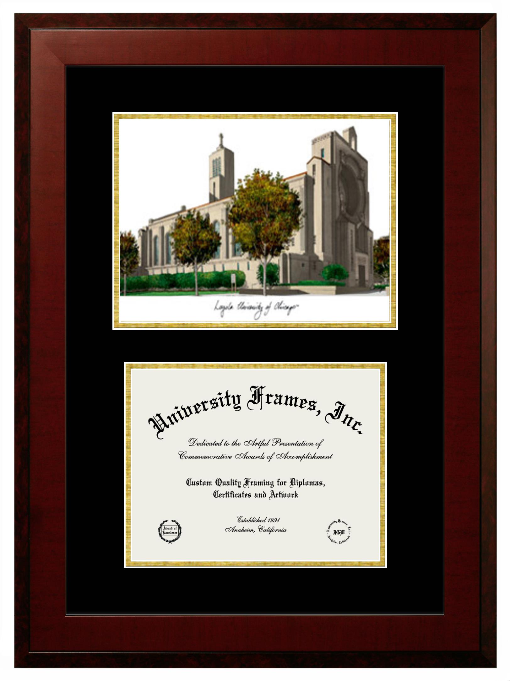 Hey there, Loyola University Chicago Quinlan School of Business grads. Congratulations for your accomplishment! Since youโre here, you must be looking for a professional graduation frame to preserve and showcase your Loyola University Chicago Quinlan School of Business diploma. Or, you may be looking for a diploma frame for another grad. We at University Frames, create the finest diploma frames and are licensed with Loyola University Chicago Quinlan School of Business. Each of our degree frames is handcrafted in the US using the finest hardwood and with an exemplary level of attention to detail. Customize your diploma frame using our easy and intuitive online design tool.