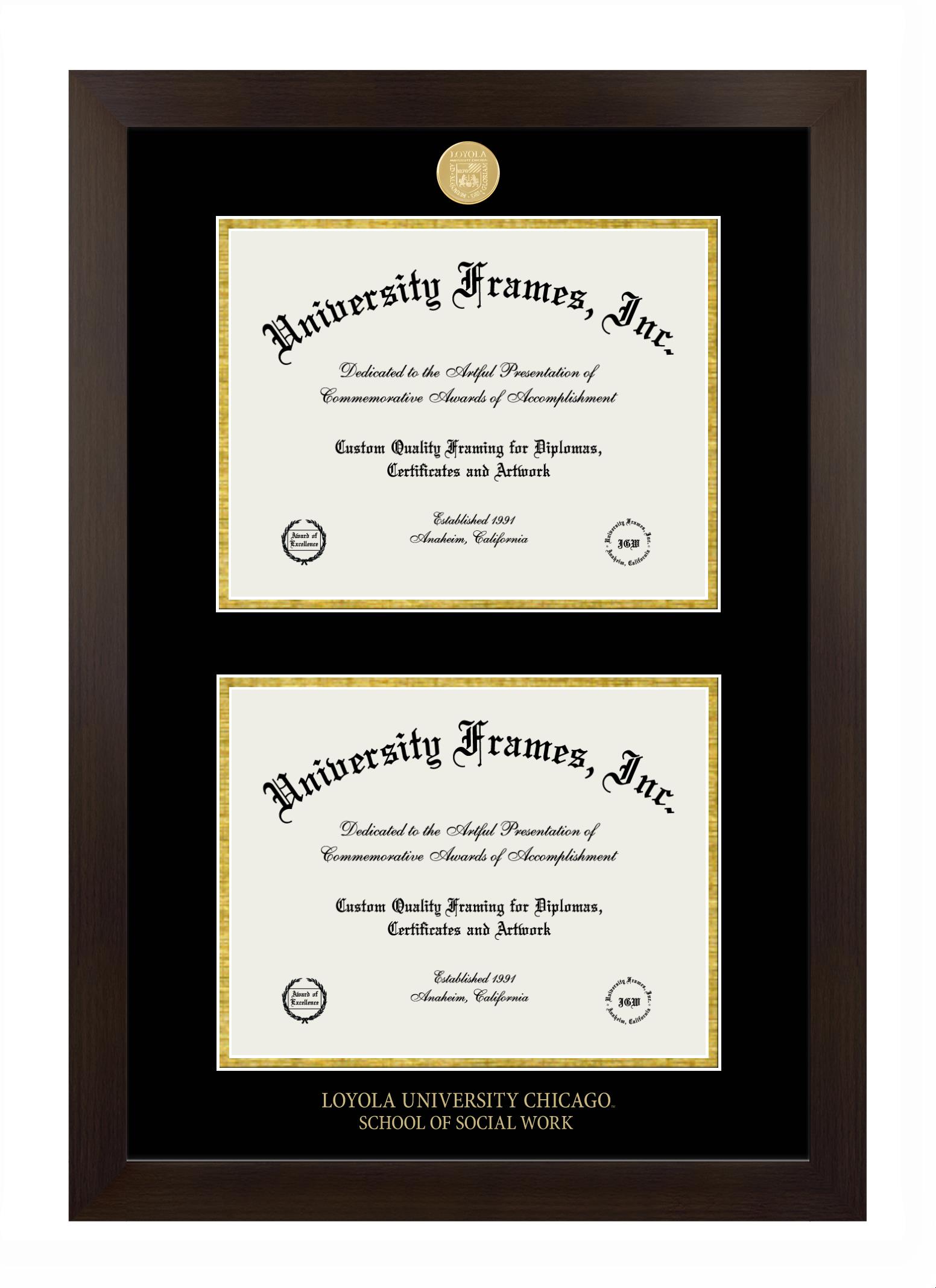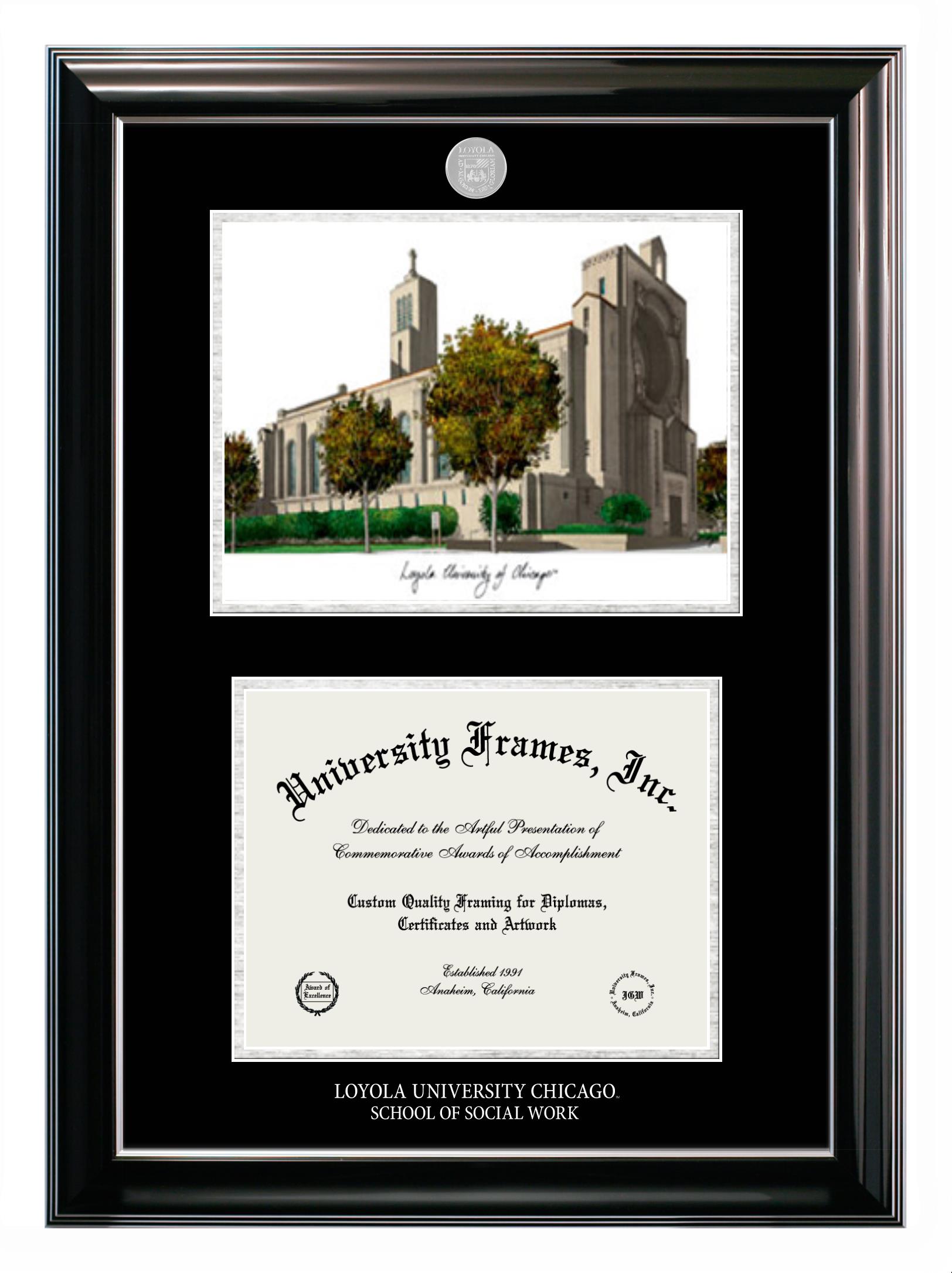 Hey there, Loyola University Chicago School of Social Work grads. Congratulations for your accomplishment! Since youโre here, you must be looking for a professional graduation frame to preserve and showcase your Loyola University Chicago School of Social Work diploma. Or, you may be looking for a diploma frame for another grad. We at University Frames, create the finest diploma frames and are licensed with Loyola University Chicago School of Social Work. Each of our degree frames is handcrafted in the US using the finest hardwood and with an exemplary level of attention to detail. Customize your diploma frame using our easy and intuitive online design tool.