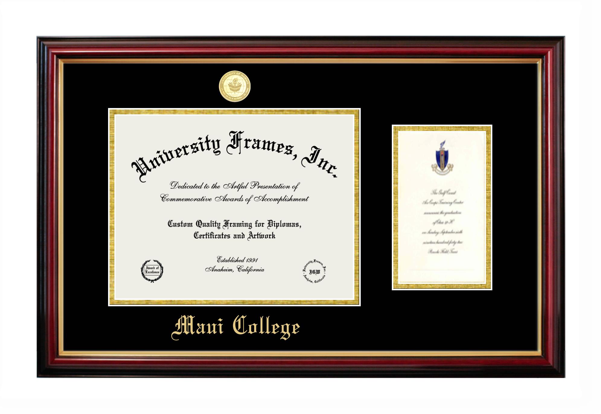 Hey there, Maui College grads. Congratulations for your accomplishment! Since you’re here, you must be looking for a professional graduation frame to preserve and showcase your Maui College diploma. Or, you may be looking for a diploma frame for another grad. We at University Frames, create the finest diploma frames and are licensed with Maui College. Each of our degree frames is handcrafted in the US using the finest hardwood and with an exemplary level of attention to detail. Customize your diploma frame using our easy and intuitive online design tool.