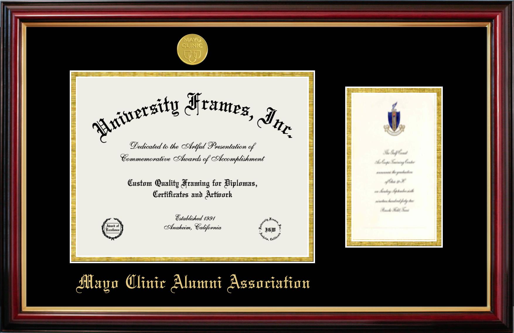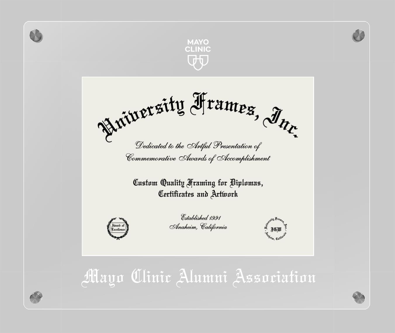 Hey there, Mayo Clinic Alumni Association grads. Congratulations for your accomplishment! Since you’re here, you must be looking for a professional graduation frame to preserve and showcase your Mayo Clinic Alumni Association diploma. Or, you may be looking for a diploma frame for another grad. We at University Frames, create the finest diploma frames and are licensed with Mayo Clinic Alumni Association. Each of our degree frames is handcrafted in the US using the finest hardwood and with an exemplary level of attention to detail. Customize your diploma frame using our easy and intuitive online design tool.