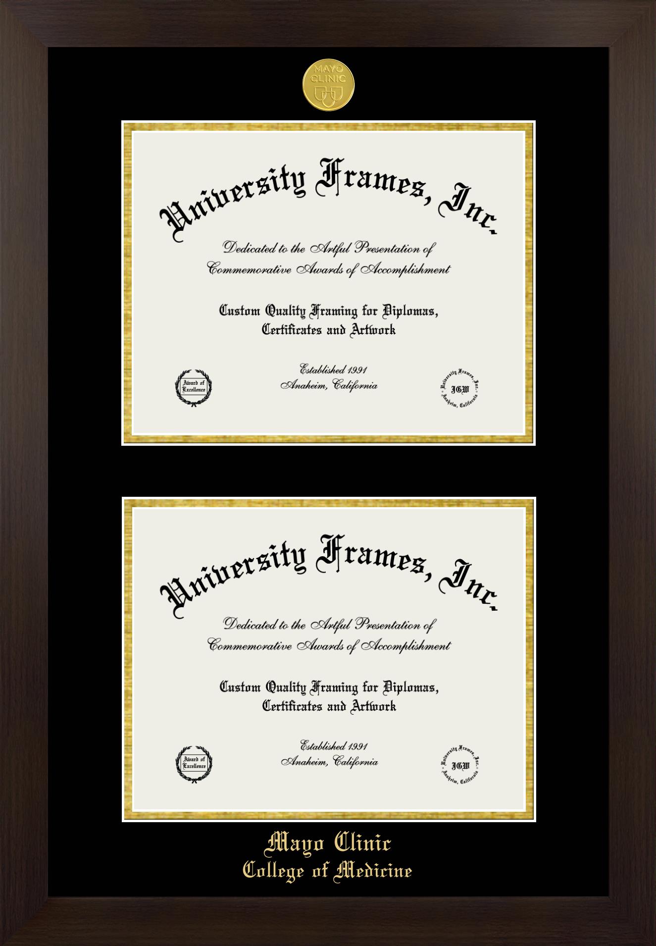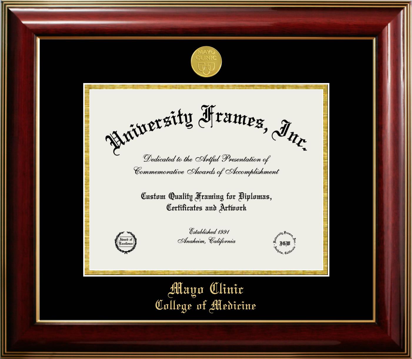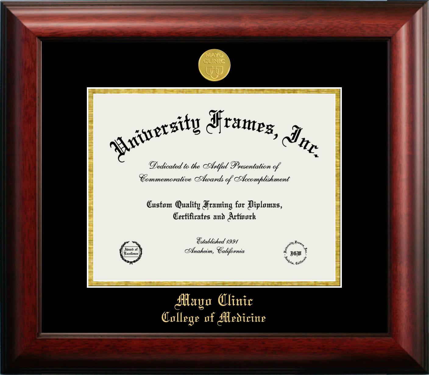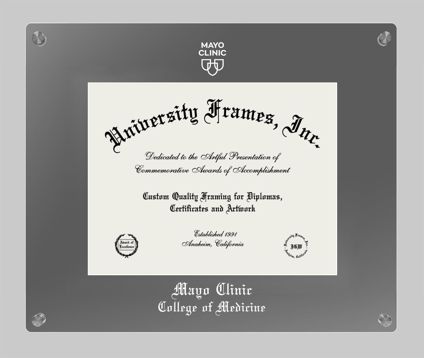 Hey there, Mayo Clinic College of Medicine (former name) grads. Congratulations for your accomplishment! Since you’re here, you must be looking for a professional graduation frame to preserve and showcase your Mayo Clinic College of Medicine (former name) diploma. Or, you may be looking for a diploma frame for another grad. We at University Frames, create the finest diploma frames and are licensed with Mayo Clinic College of Medicine (former name). Each of our degree frames is handcrafted in the US using the finest hardwood and with an exemplary level of attention to detail. Customize your diploma frame using our easy and intuitive online design tool.