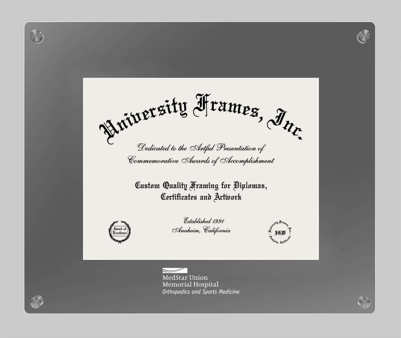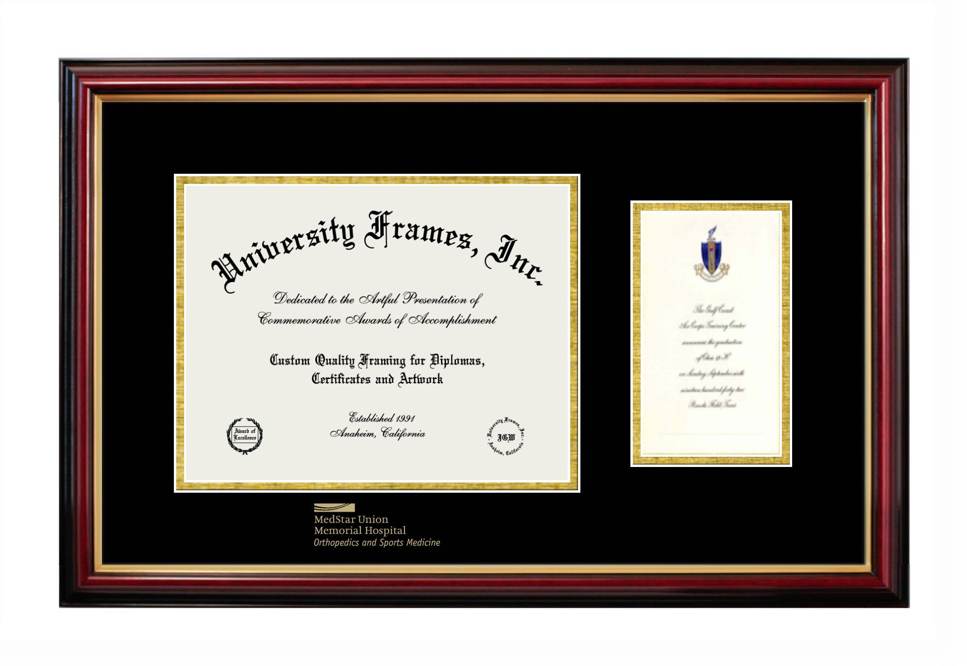 Hey there, MedStar Union Memorial Hospital grads. Congratulations on your accomplishment! Earning a degree is an achievement to be cherished forever. At University Frames, we create professional diploma frames for MedStar Union Memorial Hospital grads and alumni, offering them an elegant and impressive way to treasure their hard-earned diploma for a lifetime. Each of our degree frames is handcrafted in the US and custom-sized to fit the official MedStar Union Memorial Hospital diplomas. Customize your graduation frame using our easy and intuitive online design tool.