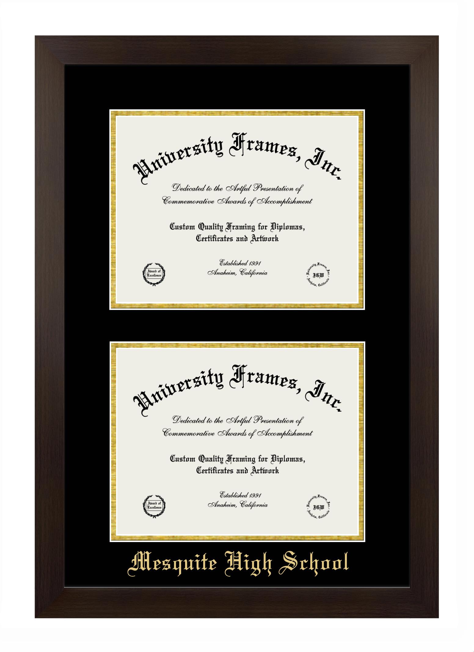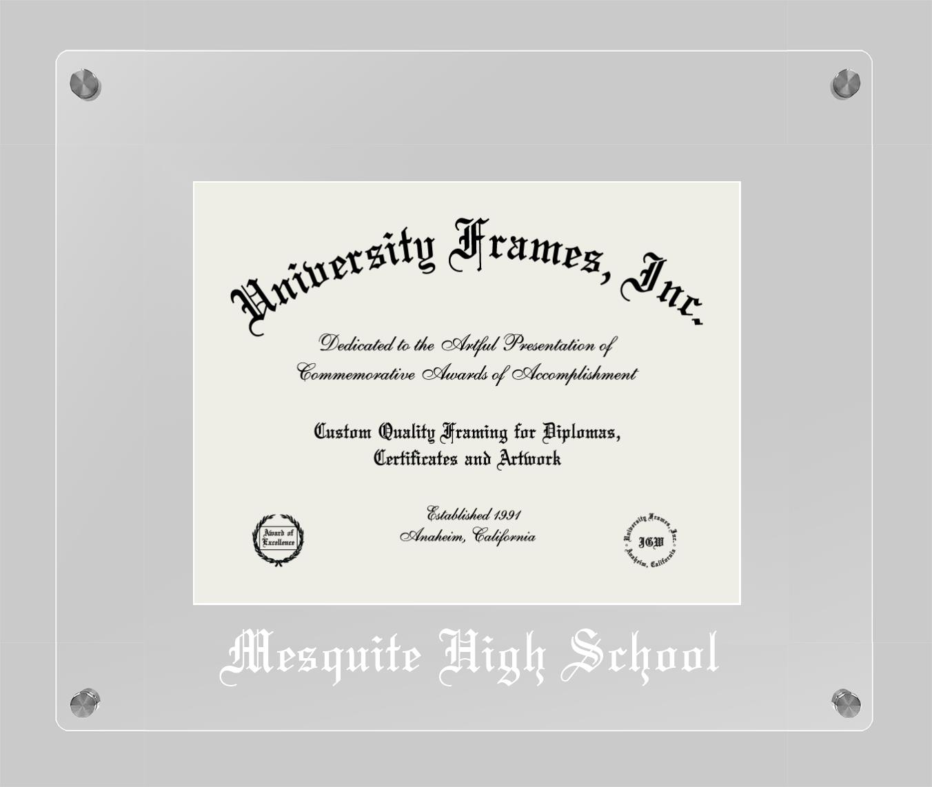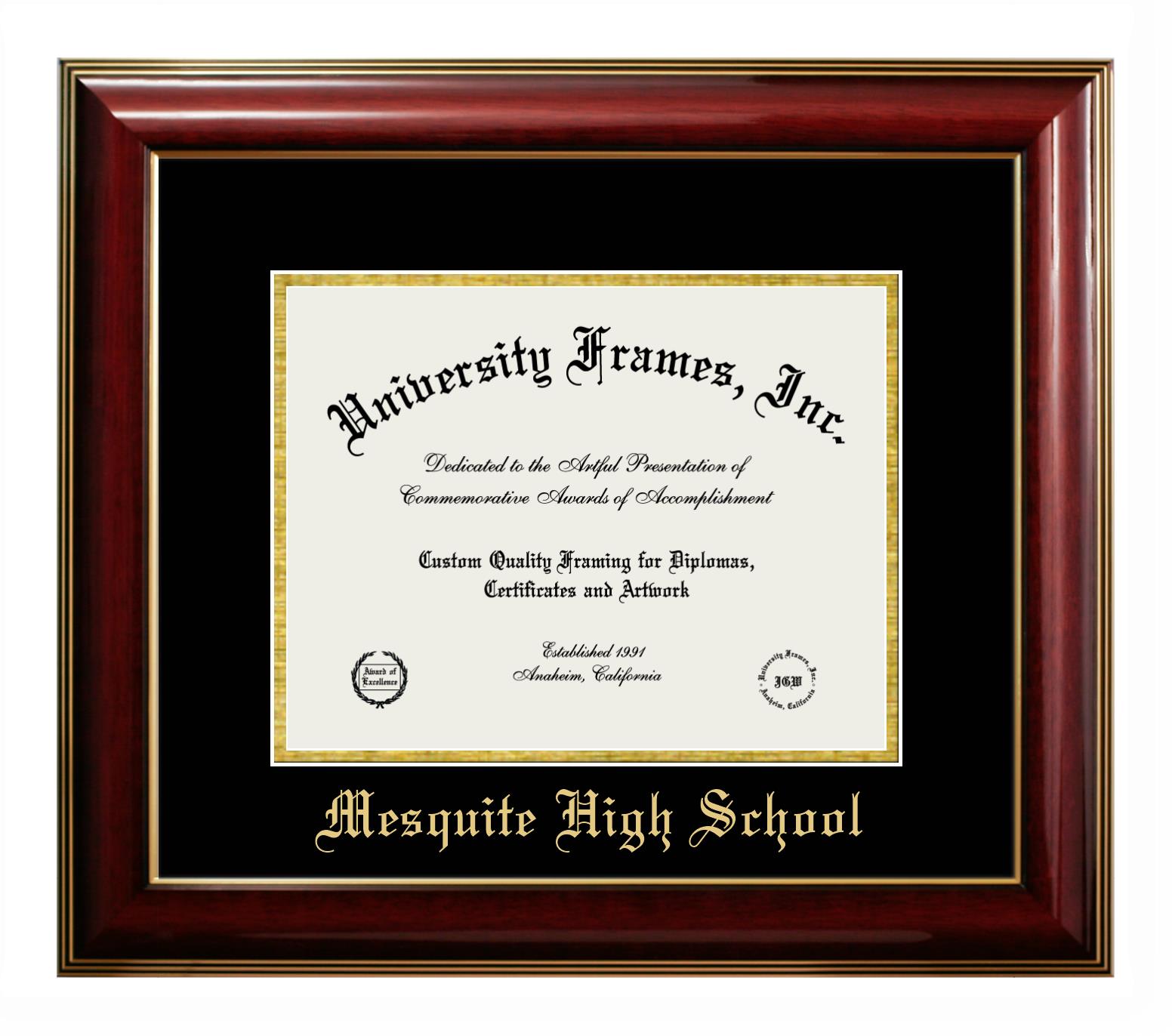 Hey there, Mesquite High School grads. Congratulations on your accomplishment! Earning a degree is an achievement to be cherished forever. At University Frames, we create professional diploma frames for Mesquite High School grads and alumni, offering them an elegant and impressive way to treasure their hard-earned diploma for a lifetime. Each of our degree frames is handcrafted in the US and custom-sized to fit the official Mesquite High School diplomas. Customize your graduation frame using our easy and intuitive online design tool.