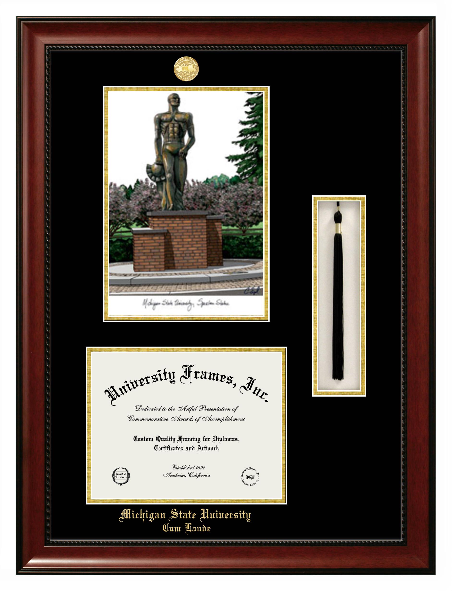 Hey there, Michigan State University Cum Laude grads. Congratulations on your accomplishment! Earning a degree is an achievement to be cherished forever. At University Frames, we create professional diploma frames for Michigan State University Cum Laude grads and alumni, offering them an elegant and impressive way to treasure their hard-earned diploma for a lifetime. Each of our degree frames is handcrafted in the US and custom-sized to fit the official Michigan State University Cum Laude diplomas. Customize your graduation frame using our easy and intuitive online design tool.