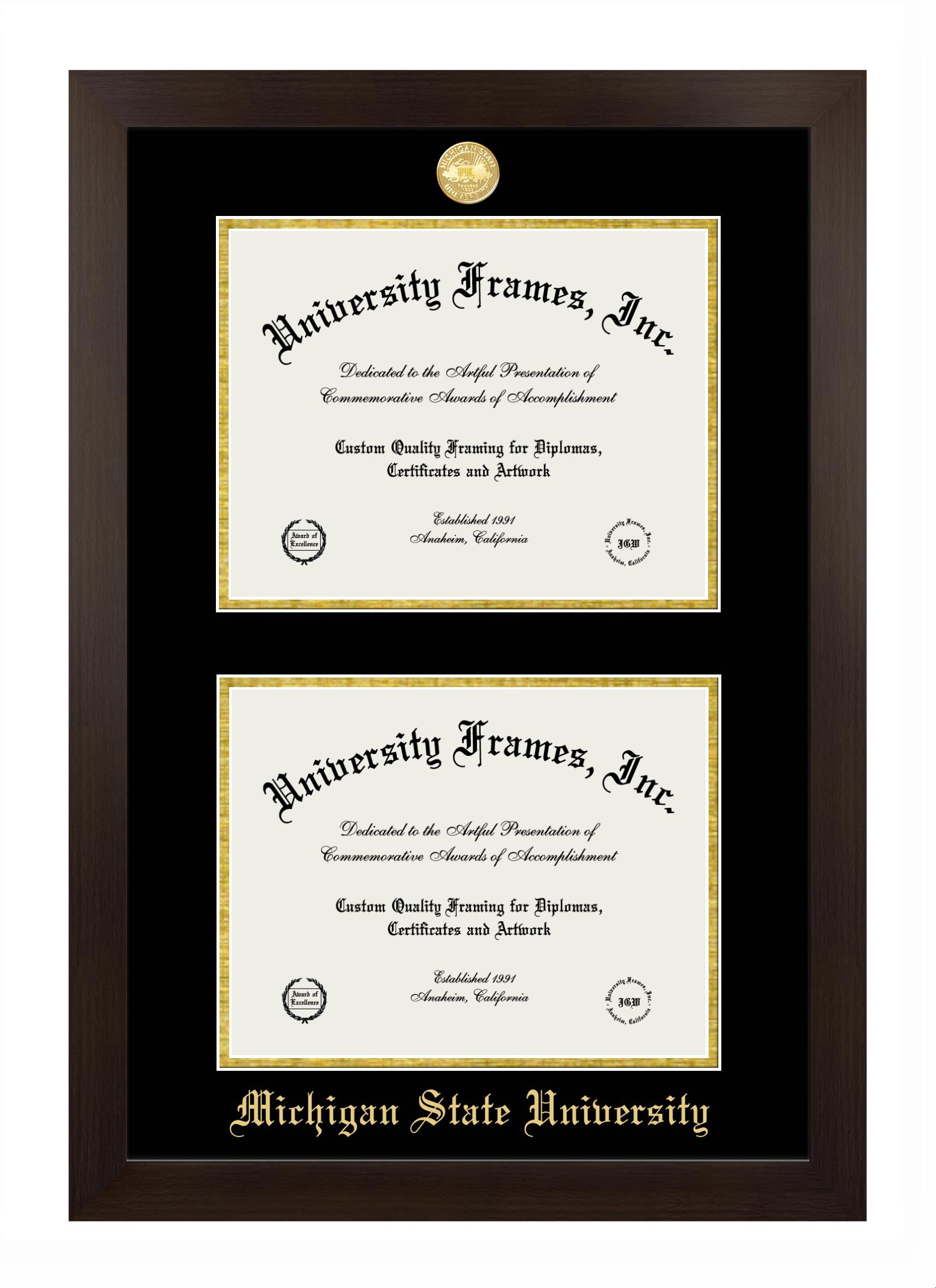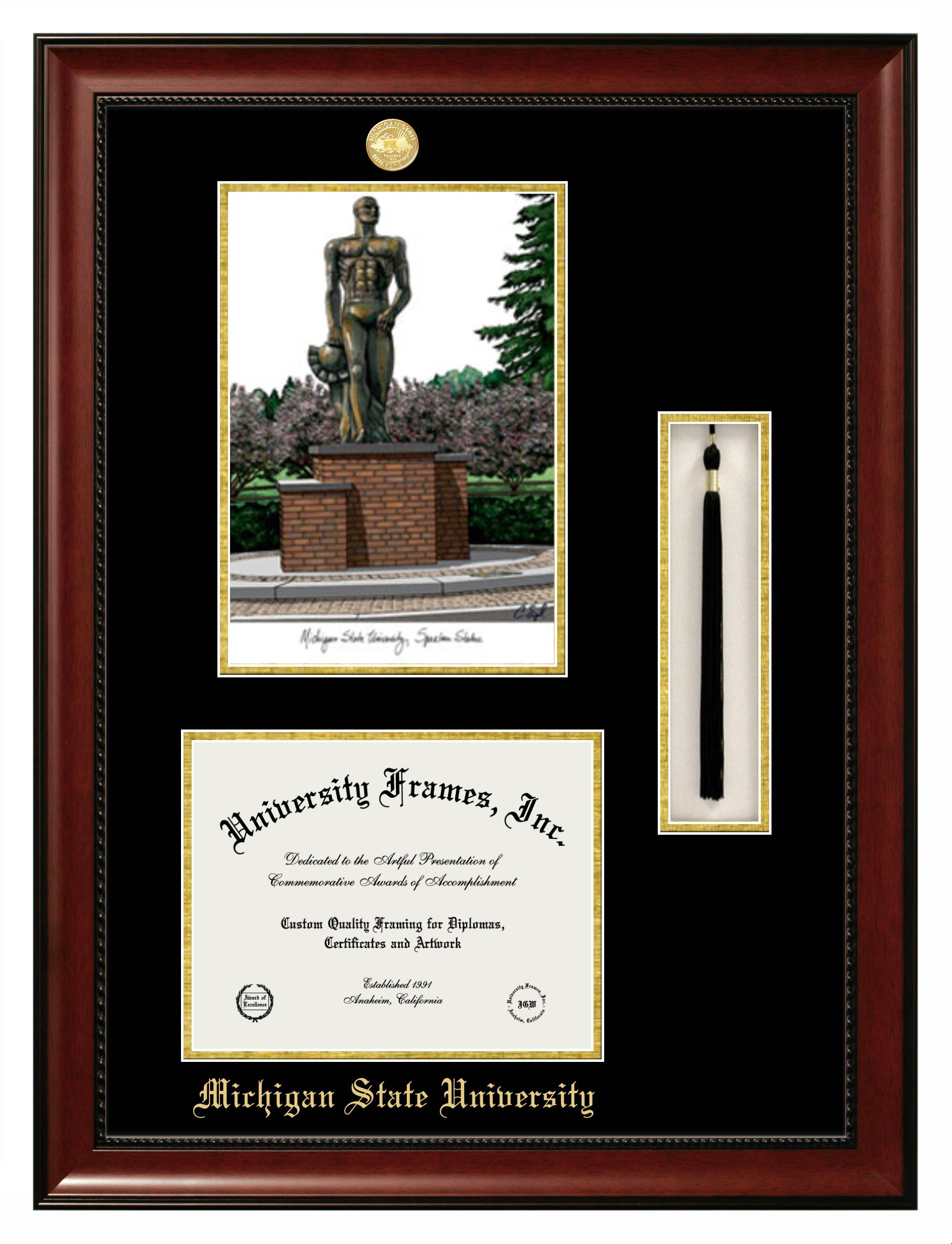 Hey there, Michigan State University grads. Congratulations on your accomplishment! Earning a degree is an achievement to be cherished forever. At University Frames, we create professional diploma frames for Michigan State University grads and alumni, offering them an elegant and impressive way to treasure their hard-earned diploma for a lifetime. Each of our degree frames is handcrafted in the US and custom-sized to fit the official Michigan State University diplomas. Customize your graduation frame using our easy and intuitive online design tool.