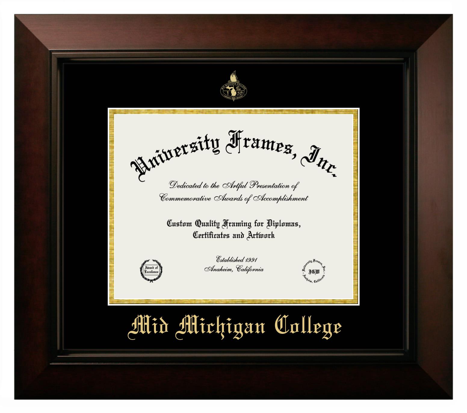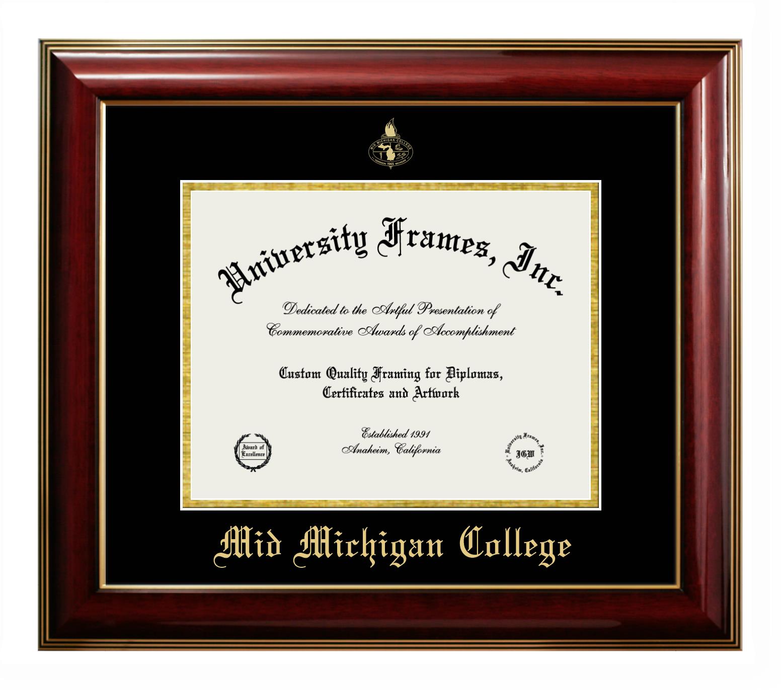 Hey there, Mid Michigan College grads. Congratulations on your accomplishment! Earning a degree is an achievement to be cherished forever. At University Frames, we create professional diploma frames for Mid Michigan College grads and alumni, offering them an elegant and impressive way to treasure their hard-earned diploma for a lifetime. Each of our degree frames is handcrafted in the US and custom-sized to fit the official Mid Michigan College diplomas. Customize your graduation frame using our easy and intuitive online design tool.