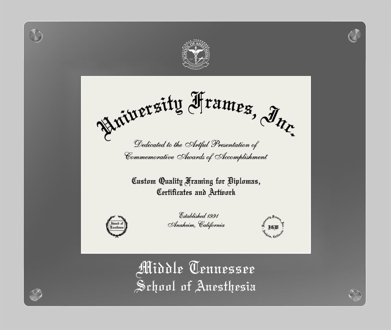 Hey there, Middle Tennessee School of Anesthesia grads. Congratulations on your accomplishment! Earning a degree is an achievement to be cherished forever. At University Frames, we create professional diploma frames for Middle Tennessee School of Anesthesia grads and alumni, offering them an elegant and impressive way to treasure their hard-earned diploma for a lifetime. Each of our degree frames is handcrafted in the US and custom-sized to fit the official Middle Tennessee School of Anesthesia diplomas. Customize your graduation frame using our easy and intuitive online design tool.