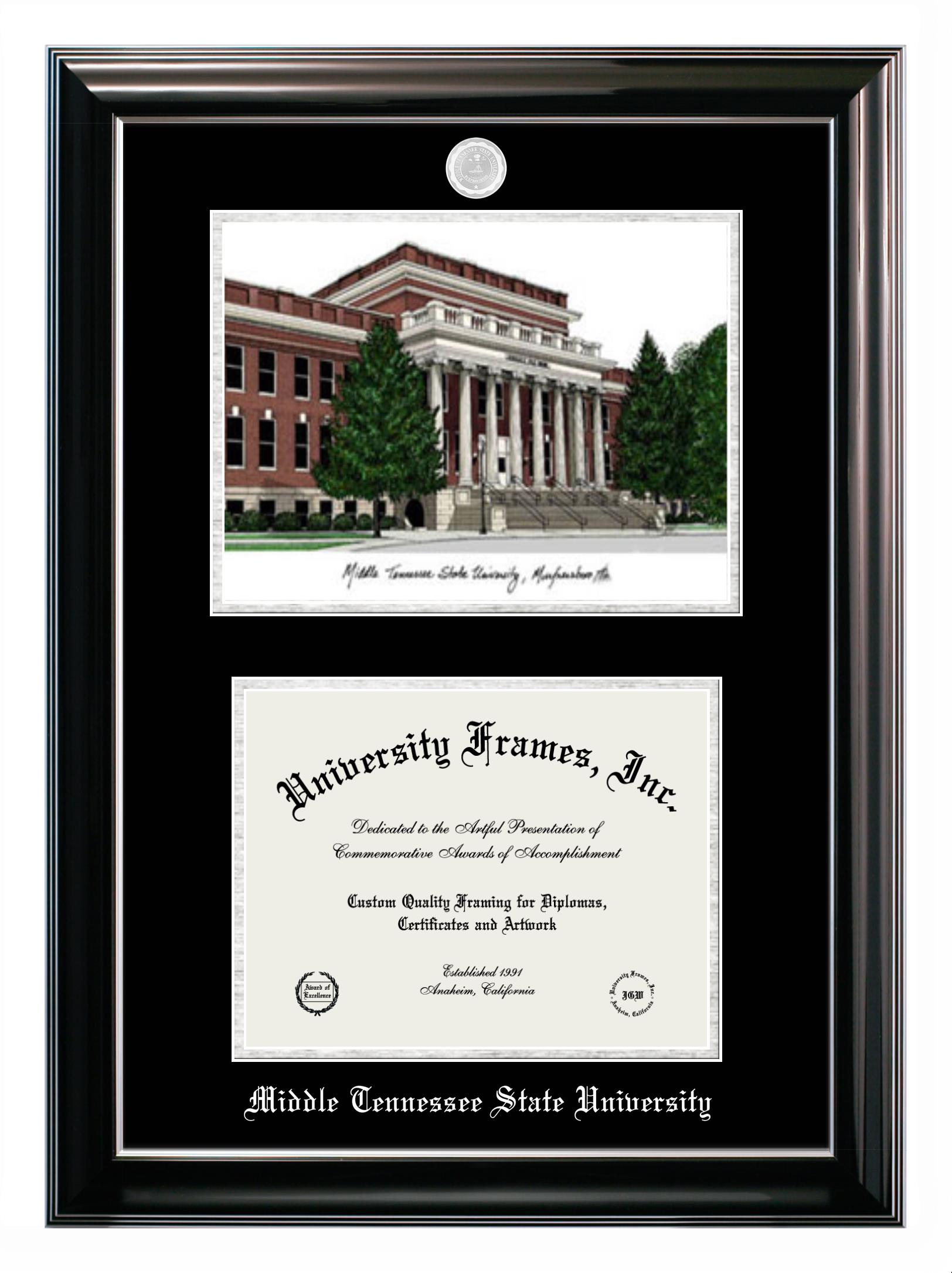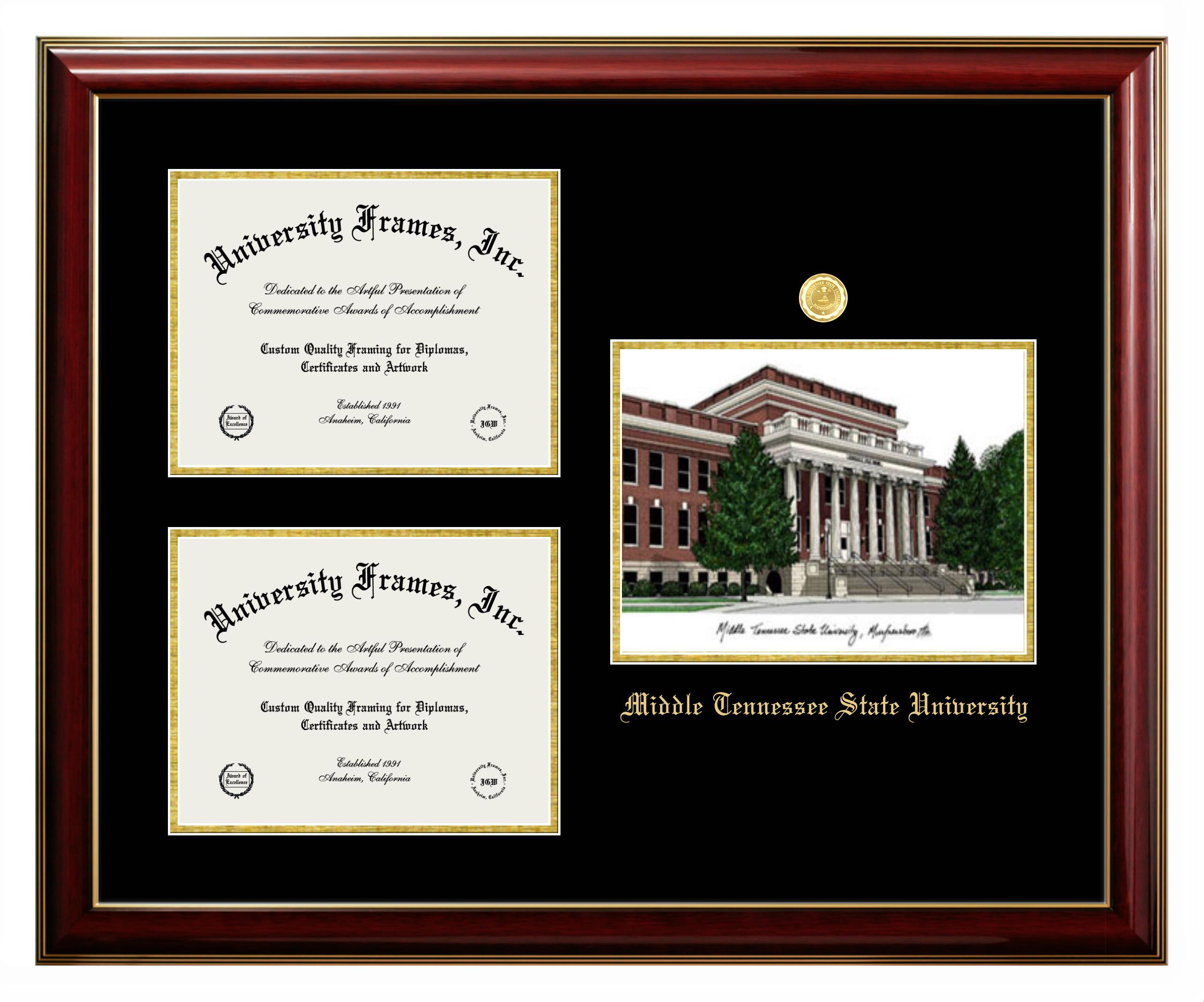 Hey there, Middle Tennessee State University grads. Congratulations on your accomplishment! Earning a degree is an achievement to be cherished forever. At University Frames, we create professional diploma frames for Middle Tennessee State University grads and alumni, offering them an elegant and impressive way to treasure their hard-earned diploma for a lifetime. Each of our degree frames is handcrafted in the US and custom-sized to fit the official Middle Tennessee State University diplomas. Customize your graduation frame using our easy and intuitive online design tool.