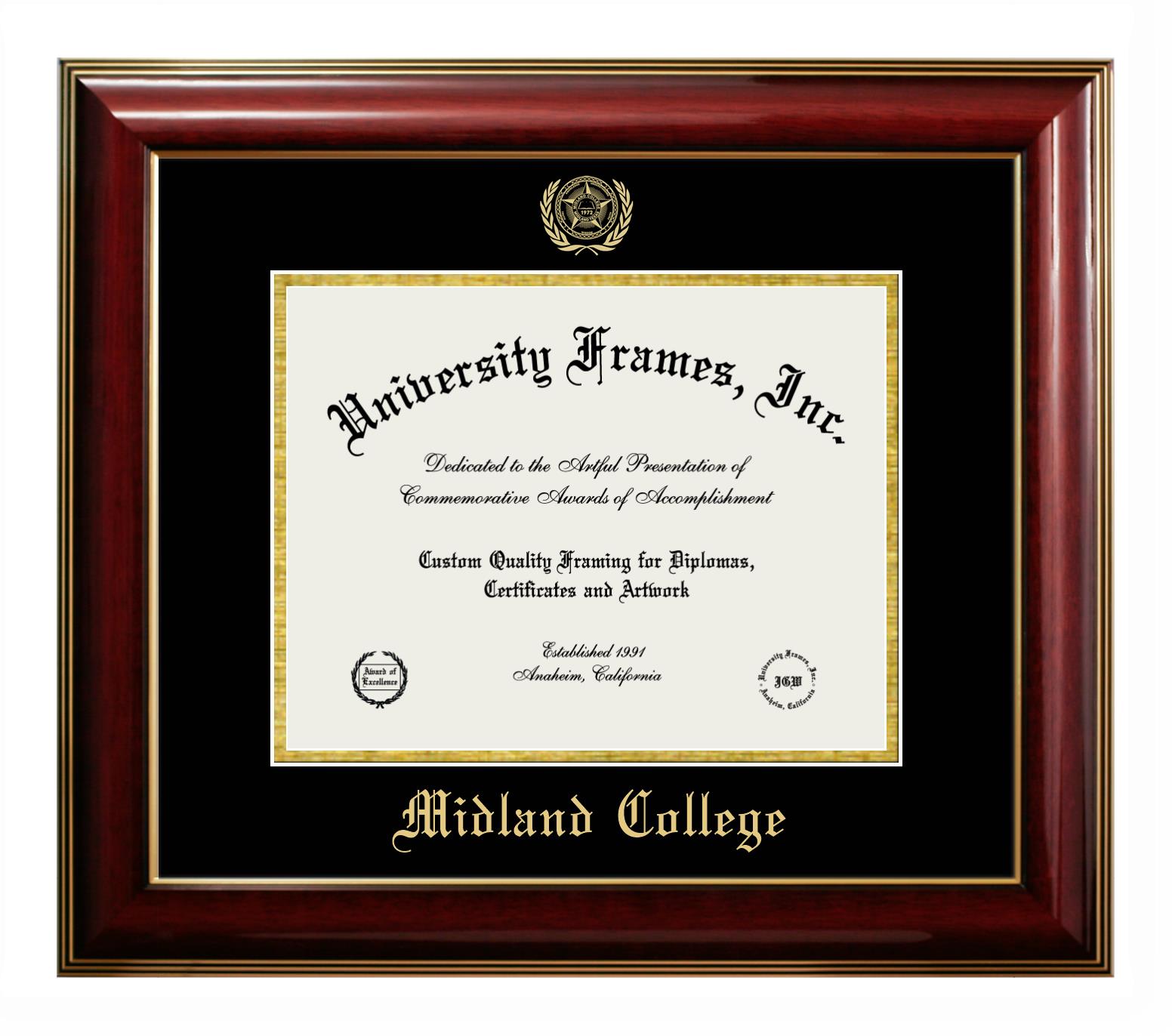 Hey there, Midland College grads. Congratulations on your accomplishment! Earning a degree is an achievement to be cherished forever. At University Frames, we create professional diploma frames for Midland College grads and alumni, offering them an elegant and impressive way to treasure their hard-earned diploma for a lifetime. Each of our degree frames is handcrafted in the US and custom-sized to fit the official Midland College diplomas. Customize your graduation frame using our easy and intuitive online design tool.